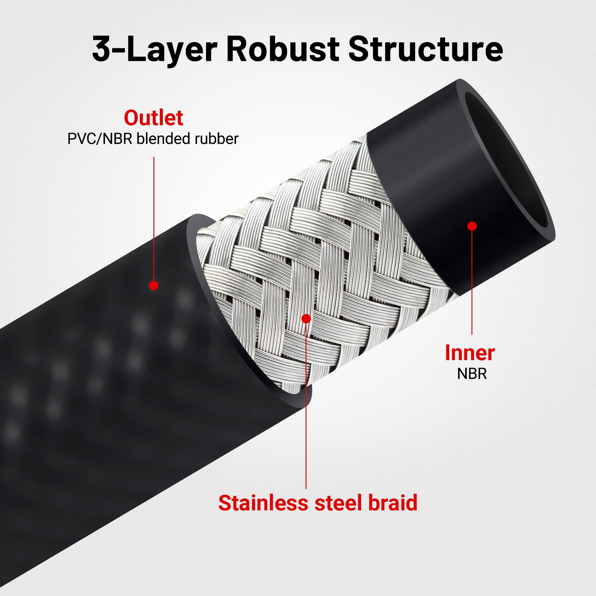 [Material] Nitrile rubber inner,stainless steel braid in the mid,PVC and Nitrile blended rubber outer.