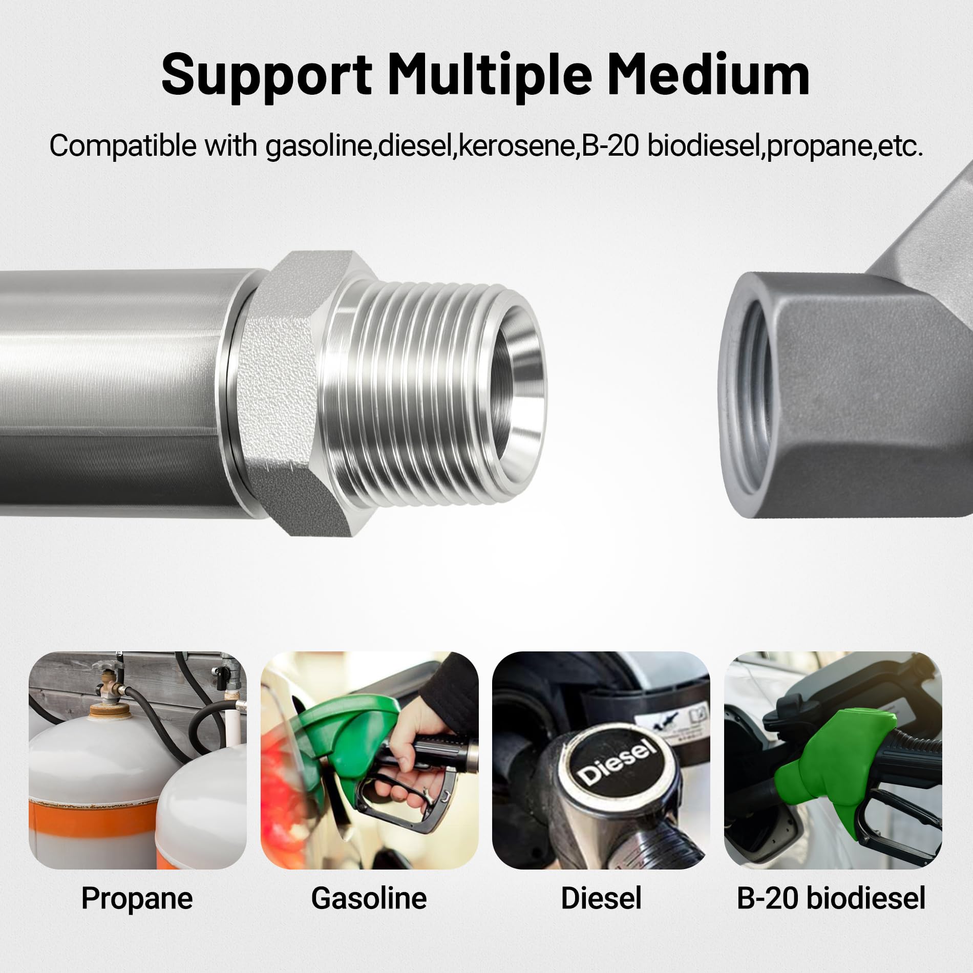 [Compatibility] Fuel dispensing hose compatible with multiple liquids,such as diesel,gasoline,propane,kerosene,B-20 biodiesel,E15 ethanol,biodiesel,grease,E85E100,E10,mineral spirits, petroleum,oils,100% biodiesel,etc.