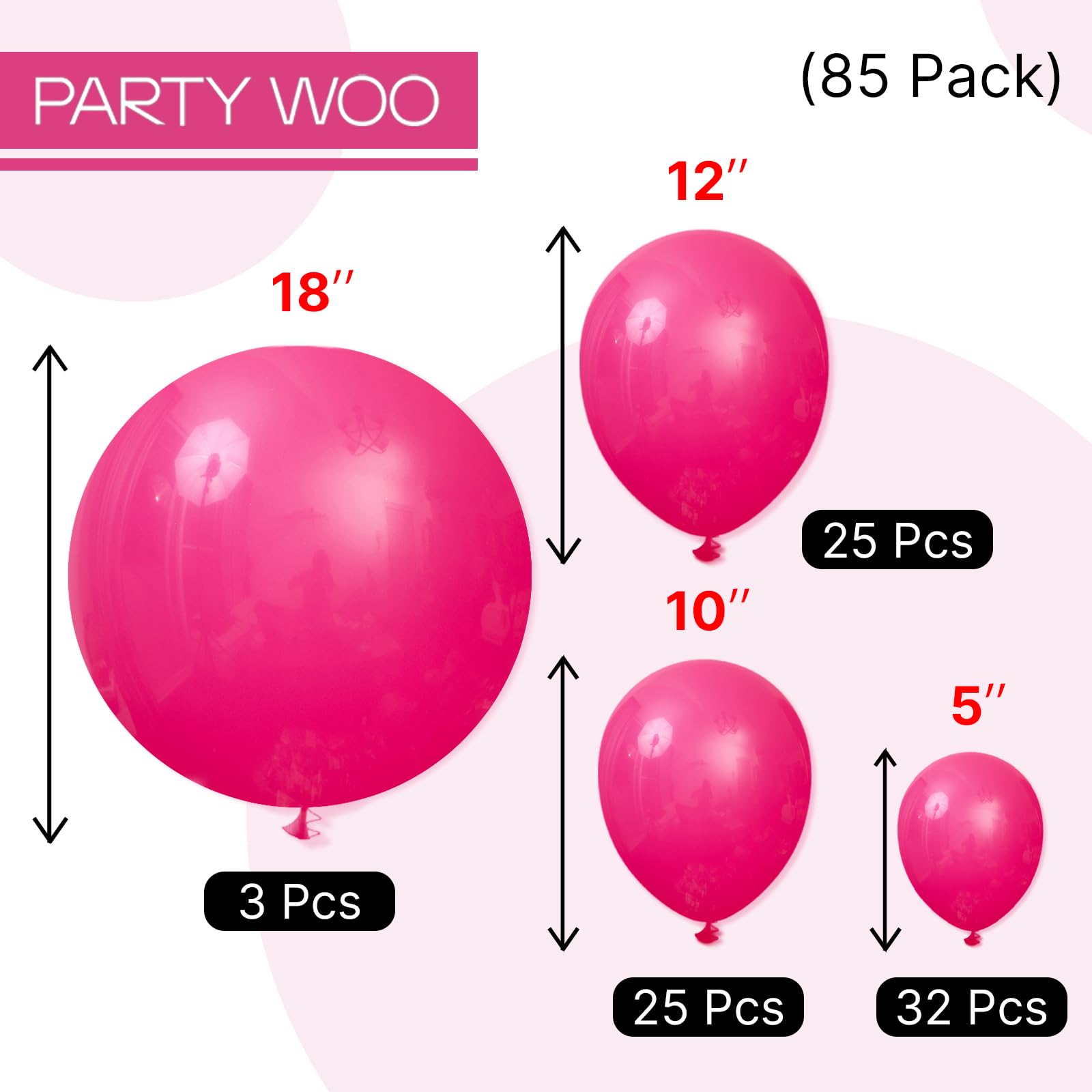 Package includes: 18 inch magenta balloons (3pcs), 12 inch magenta balloons (25pcs), 10 inch magenta balloons (25pcs), 5 inch magenta balloons (32pcs), used in birthday, wedding. Pay attention the 5 inch balloons could NOT float when inflated with HELIUM.