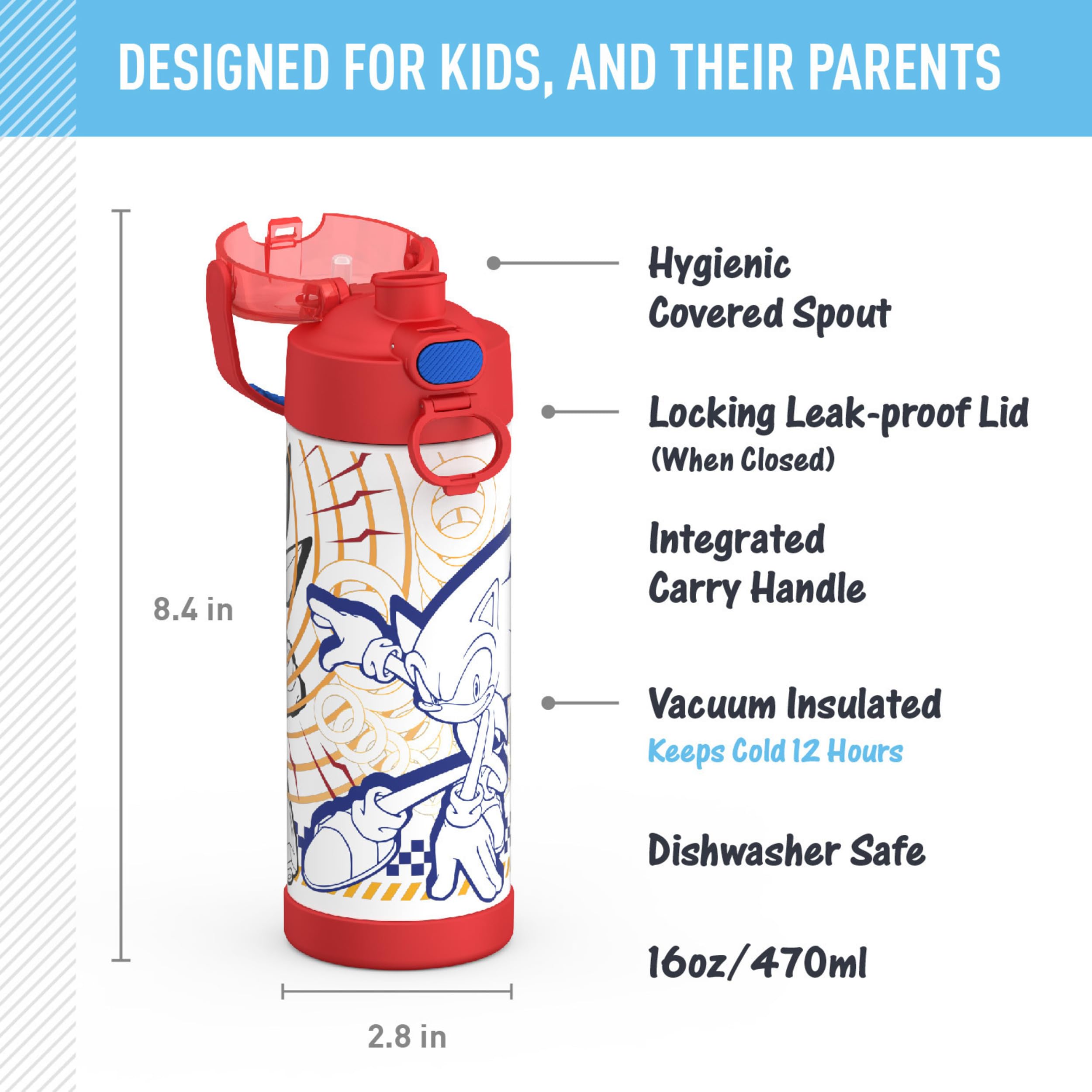 The FUNtainer 16-ounce Vacuum Insulated Stainless Steel Water Bottle with Spout keeps drinks cold for up to 12 hours. Our kids water bottles are built so their drinks are as cool on the inside as they look on the outside. Kids stay hydrated and parents stay happy. The double wall stainless steel construction is built to handle drops, dings and assorted roughhousing. Includes an integrated carry handle with soft-touch grip, making it easy for kids to carry with them throughout the day. Help keep germs away with the hygienically covered drinking spout. To clean, you can pop your FUNtainer water bottle in the dishwasher; however washing by hand is recommended. Not for use with hot liquids.