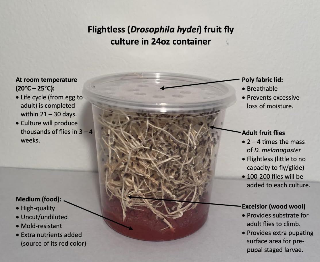 Flightless D. hydei fruit fly culture (24oz container) D. hydei fruit flies are ideal feeder insects for small or young animals. They are about twice as large as D. melanogaster. Unlike crickets or other typical feeder insects, fruit flies cannot bite or harm your pet. They are easy to maintain and reproduce quickly (D. hydei reproduce slower than D. melanogaster). The life cycle of D. hydei is complete in about 4 weeks while that of D. melanogaster is complete in under two weeks. Life cycle: Fruit flies undergo complete metamorphosis. They begin life as eggs which, within 2-4 days of being laid, will hatch into larvae called maggots. Maggots feed on and live within the media provided at the bottom of the container. They remain in the media until ready to pupate. At this point, the larvae will crawl to the sides of the container and on the wood shaving substrate to pupate. They will remain in their pupal stage for about a week. Pupae will change from a orange-brown color to transparent (you can see the fly inside!) When they are ready to eclose (emerge as an adult from a pupae). Newly emerged adult flies are sensitive and shouldn’t be handled for about an hour. In a couple of days, they will be ready to mate and lay eggs. Temperature/humidity: The life cycle progression of fruit flies, like other insects, is dependent on the temperature at which they are kept. While room temperature is ideal for maintaining flies, they can tolerate colder temperatures. If necessary, they can be refrigerated (NOT FROZEN) for about a week without inflicting any harm to the flies at any stage of life. Refrigerating the flies will cause them to be very sluggish or immobile until temperatures warm up. As a result, temporary refrigeration can be used to separate/transfer flies elsewhere. As long as there is adequate air exchange, and the media is properly hydrated, humidity isn’t a crucial factor. Media: The media provided is a potato-based proprietary modification of a commercially available type of fruit fly media. I supplement media with beetroot powder as this provides extra nutrients, like carotenoids, which have been shown to extend the lives of fruit flies as well as gives your pets (who eat the flies) better nutrition. Media should remain hydrated at all times. It should be smooth (like thick mashed potatoes), but never runny or sticky. Otherwise, adult flies will become trapped in the media and suffocate. If media is too dry, cracks may appear. Media that is not properly hydrated will delay the production of flies. To rehydrate, simply add water (slowly and little by little) until media appears smooth.