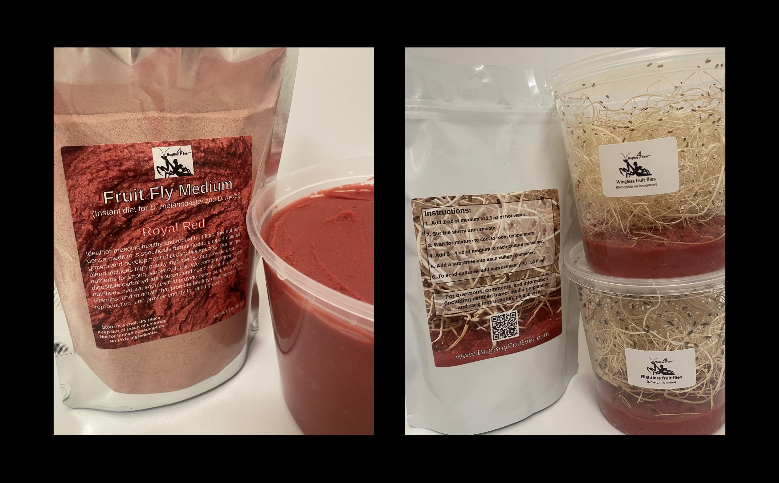 Enhanced medium (the food for larvae) to support fruit fly growth and increase nutrient density.