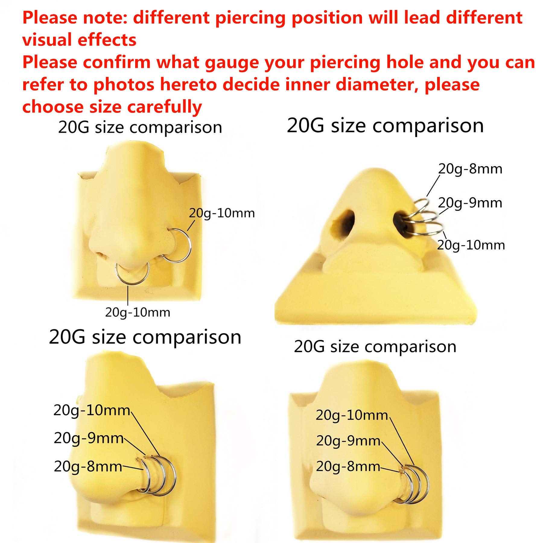 Sold individually Nose Hoop Ring/Earring Hoop Size: 20 gauge (thickness: 0.8mm), inner diameter 25/64 inches(10mm),Please choose your gauge and diameter hoop for your nose piercing needs.It has a smooth closure that doesn't slipped or opened. It's still tight after long-term use.
