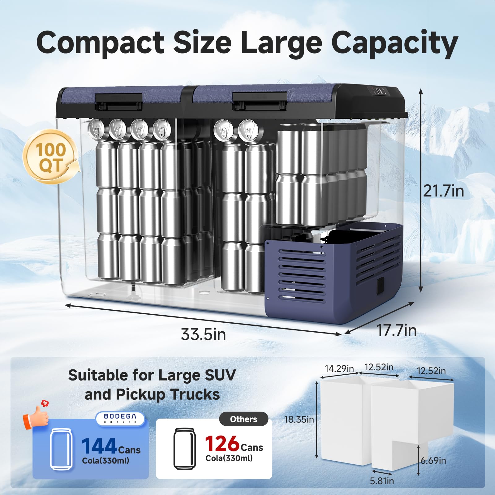 【DUAL ZONE LARGE CAR FREEZER】BODEGACOOLER car refrigerator Left zone 52.5L (56 Quart) + Right zone 42.5L (44 Quart) = 95L (100 Quart). You could control the temperature of dual zone independent. You could place meat, vegetable, drink and the other needs cold. BODEGACOOLER car refrigerator is best choice for camping, party, outdoor and travel.