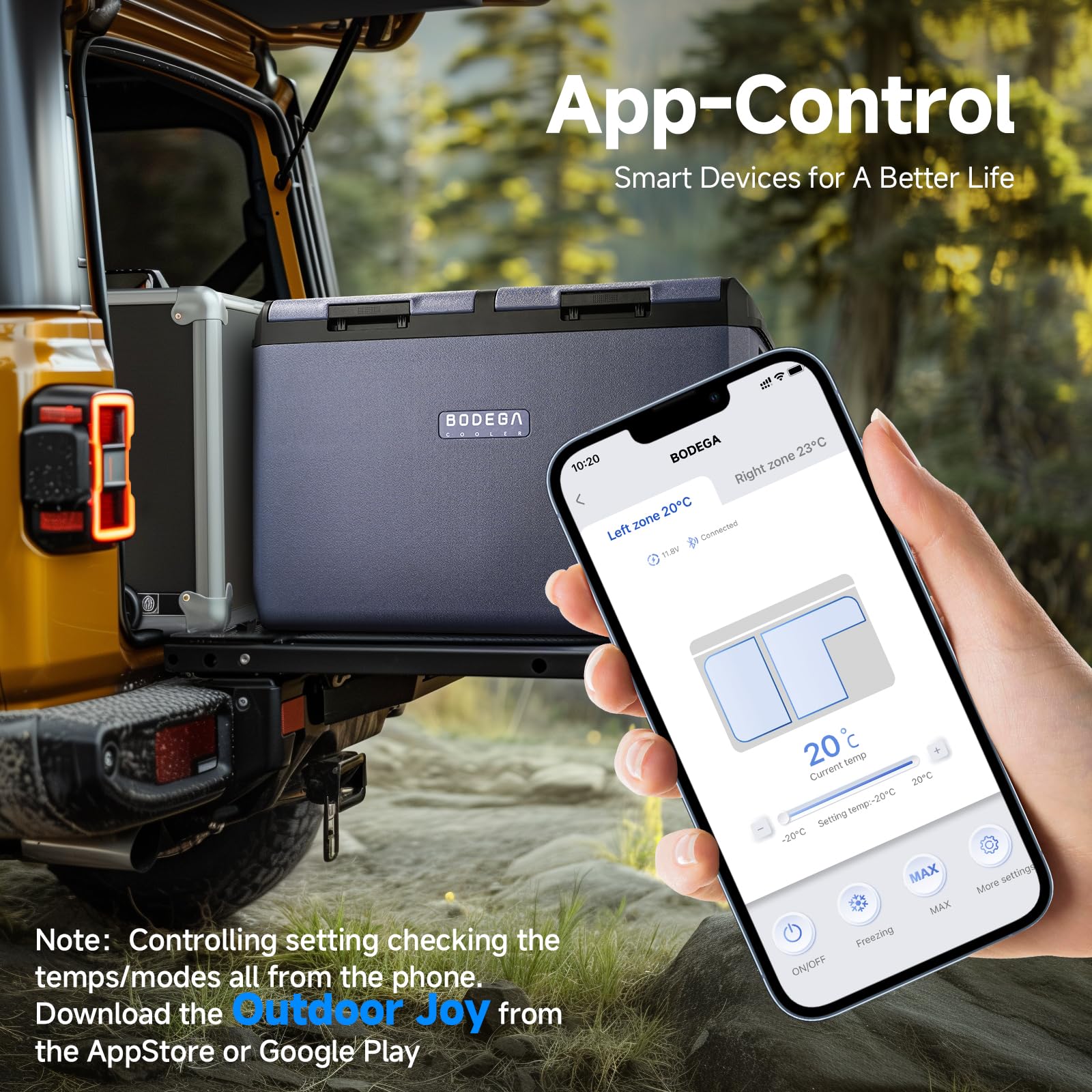 【APP CONTROL & VOLTAGE PROTECTION】Upgraded Bluetooth connection car refrigerator. BODEGACOOLER car fridge with APP control, you can control the freezer from distance or in car.Intelligent temperature control function to meet the required temperature of various ingredients. H/M/L 3-level low-voltage protection:When the measured DC voltage falls below the cut-off value, the compressor will off to prevent the vehicle from running out of power.