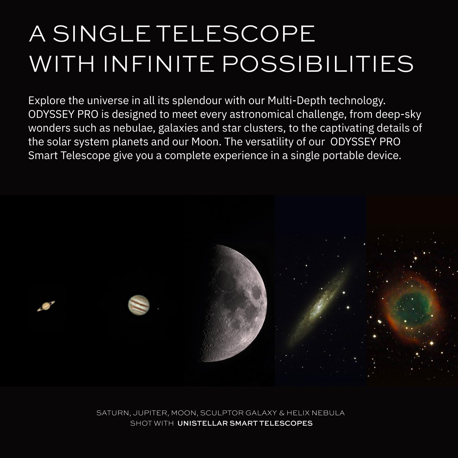 Odyssey PRO - UNISTELLAR Smart Telescope (with Eyepiece), 85mm f/3.9 (320mm) Digital & Computerized, App-Controlled Motorized Alt-Az, Enhanced Vision, RAW/FITS Export, 64GB, 5h Battery (Black)