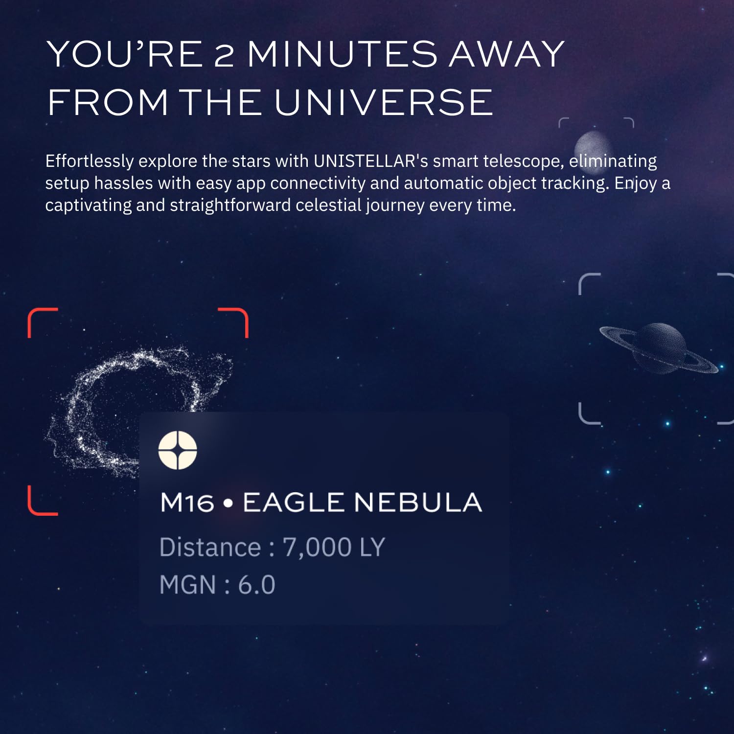 UNISTELLAR-EXCLUSIVE EYEPIECE TECHNOLOGY - The only smart telescope with eyepiece technology for immersive visual experience plus advanced digital imaging, premium clarity and comfort. You can also observe from your phone or tablet