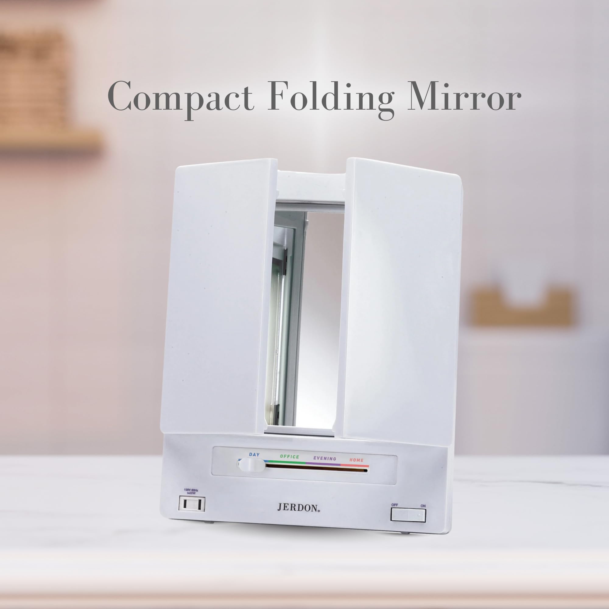 COMPACT AND CONVENIENT - This trifold mirror can be placed on any desk, vanity, or countertop. The mirror's adjustable back stand offers 11 angles, making grooming and makeup application a breeze! The compact base allows you to fold the mirrors in when not in use to save space. It also includes a built-in electrical outlet for further convenience.