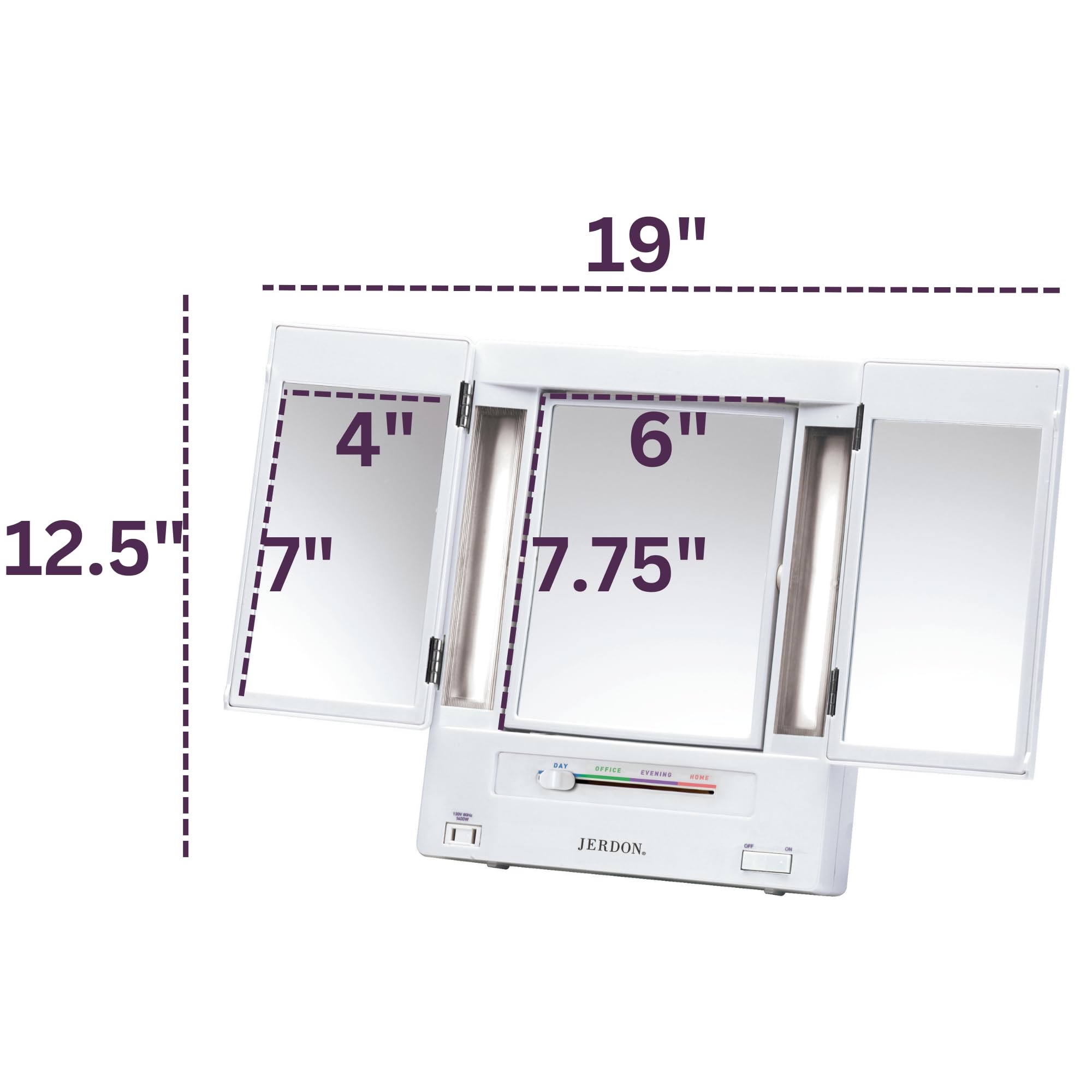 SPECIFICATIONS - This vanity mirror includes 3 mirrors with 1X and 5X magnification. The tabletop mirror has a modern white base and 4 light settings. The mirror also has a built-in electrical outlet that allows you to plug in hair curling irons and straighteners. The mirror is protected under a 1-year warranty.