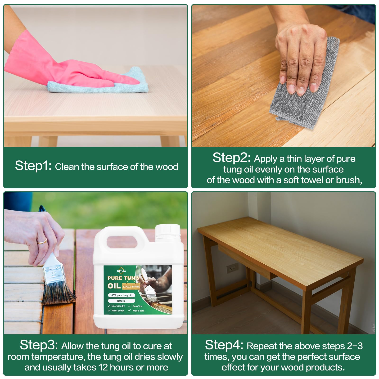 【EASY TO USE】Our 17OZ Tung Oil includes a wiping soft towel, all you need to do is to use the soft towel to apply a thin, even layer of pure tung oil on the surface of your woodwork and let the tung oil cure at room temperature. Finish and repeat 2-3 times and you will have a perfect wood finish.