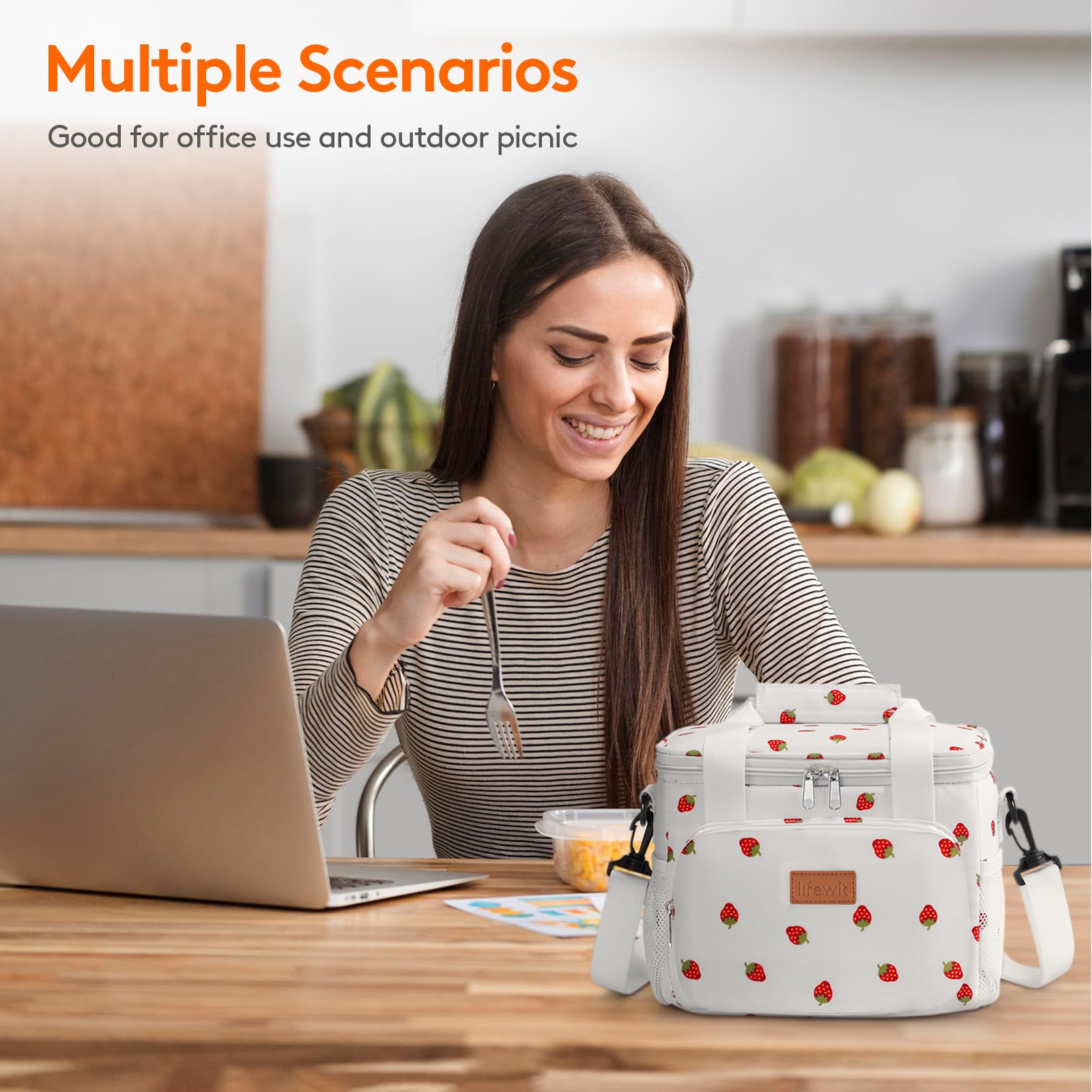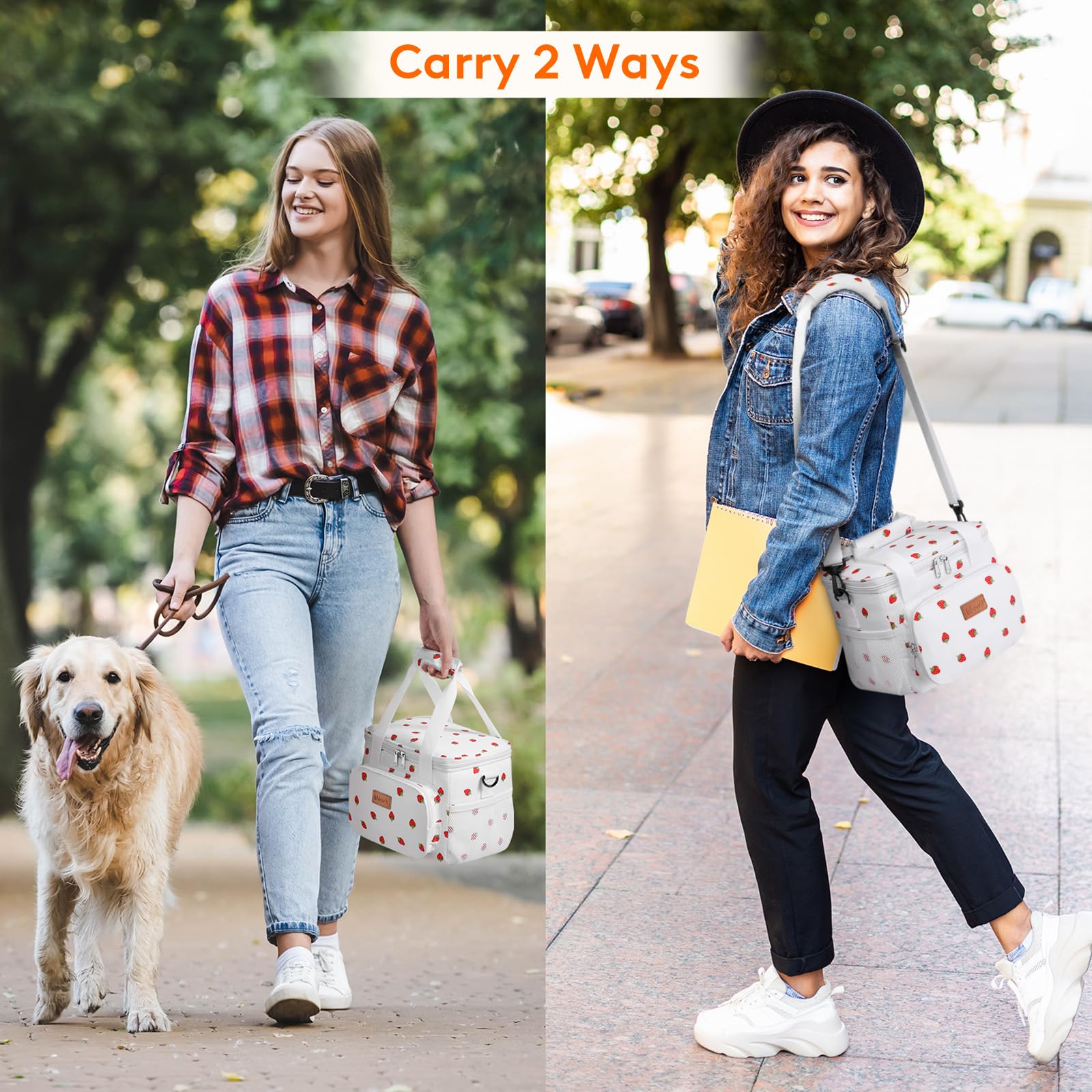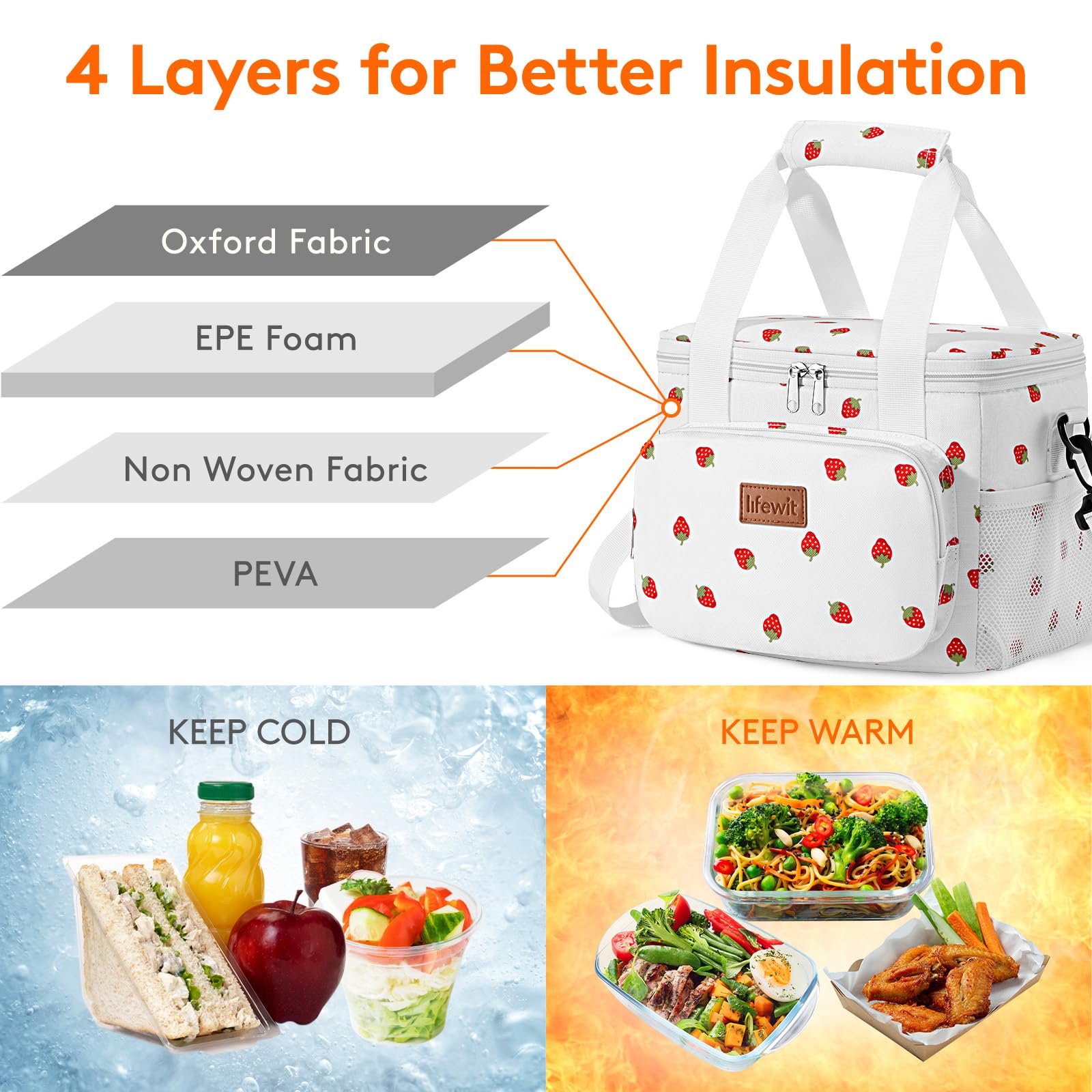 Convenient & Portable: The lid of this cooler lunch bag can be opened up widely with strong two-way zippers, which means you can put your lunch container into the bag and take out of the bag vertically. Prevent liquids from leaking out of the container and soiling inside the bag. Tough handles and shoulder strap allows you to carry it easily. Moreover, the front and side extra pocket can hold small items like keys and earbuds