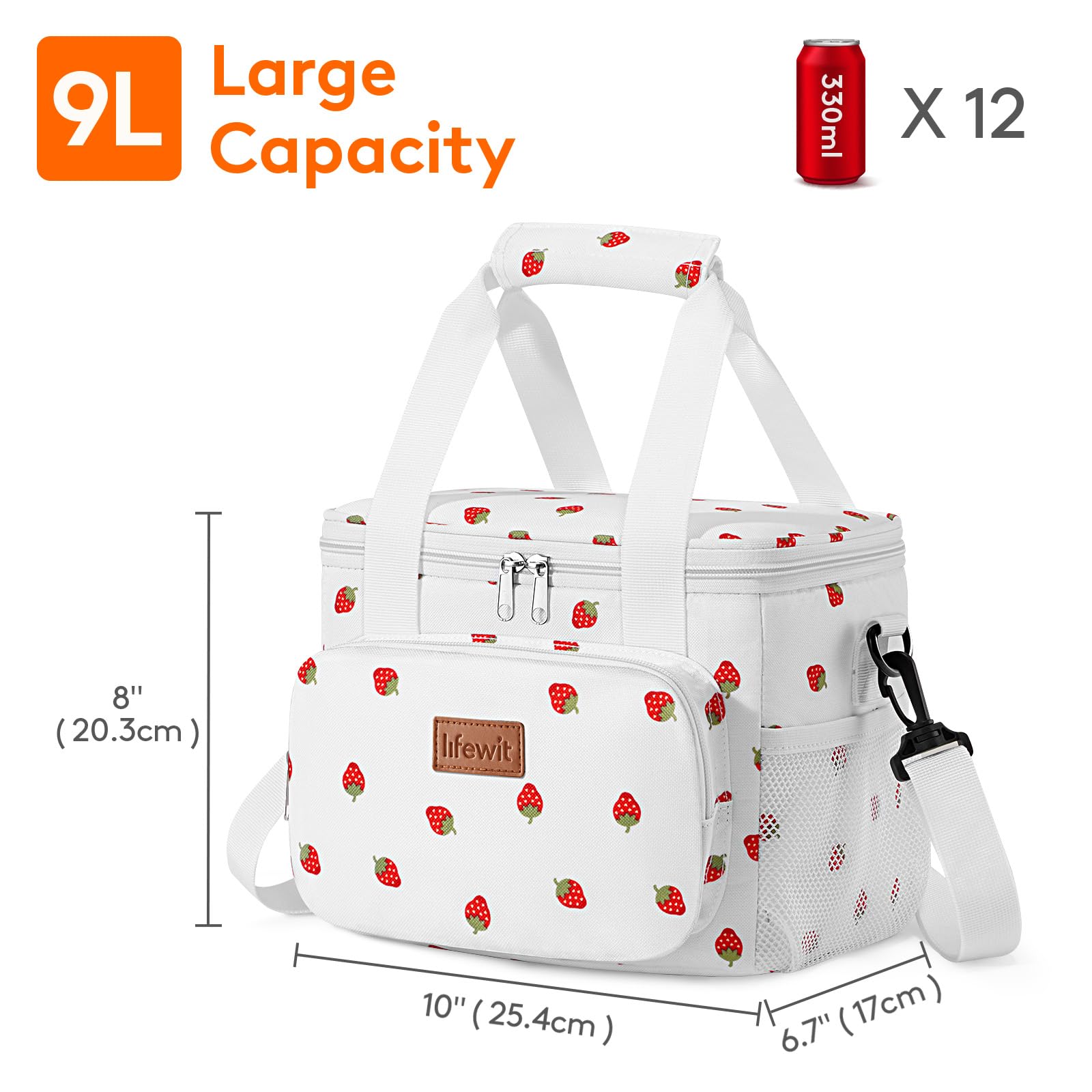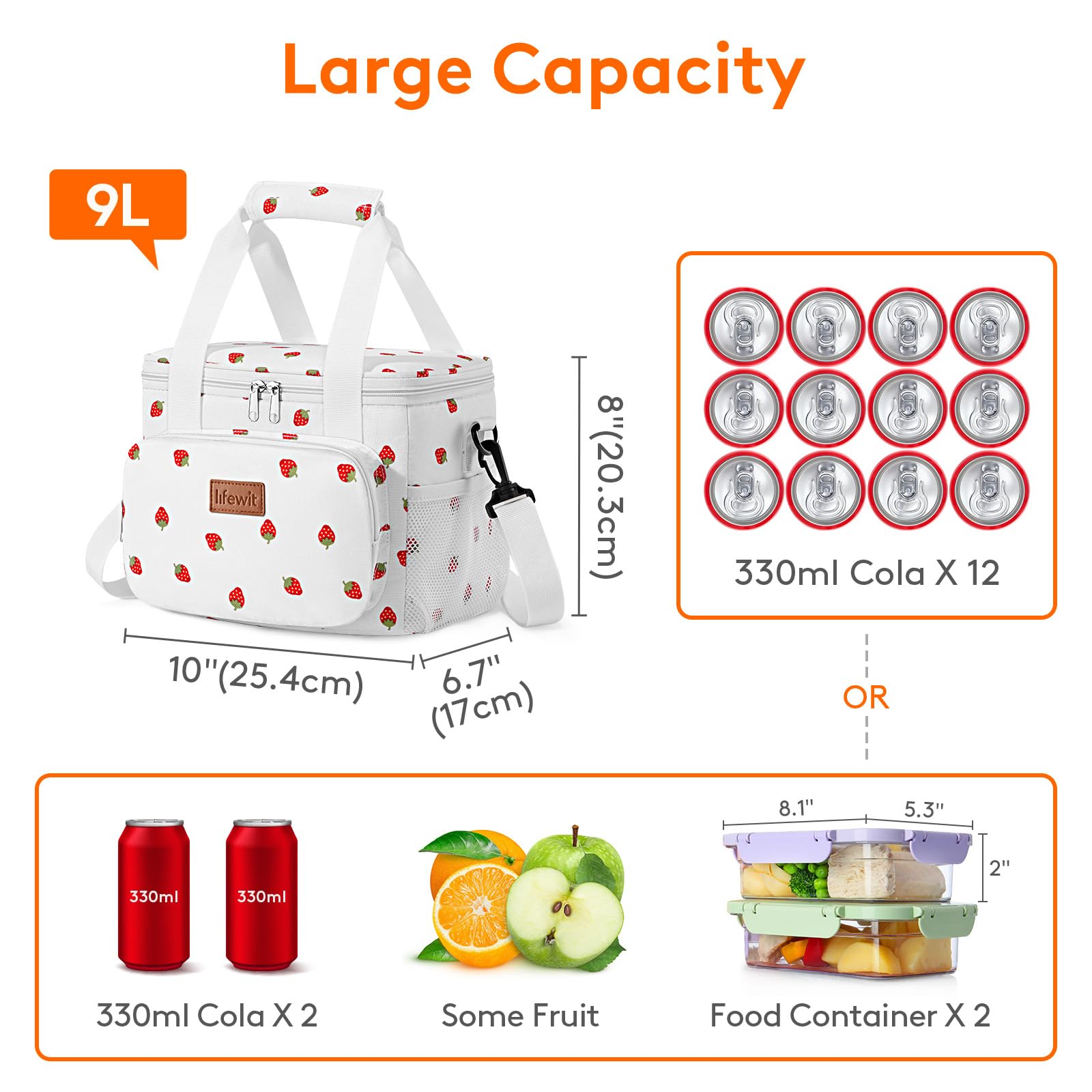 Large Capacity: Dimensions - 10" ( 25.4cm ) × 6.7" ( 17cm ) × 8" ( 20.3cm ). The maximum capacity of lunchbox for adults is 9L, and is spacious enough to store 12 cans of coke (330ml), or your lunch such as sandwiches, salad, snacks, drinks and fruits and so on. It is suitable for office, for work, picnic, beach, trip.