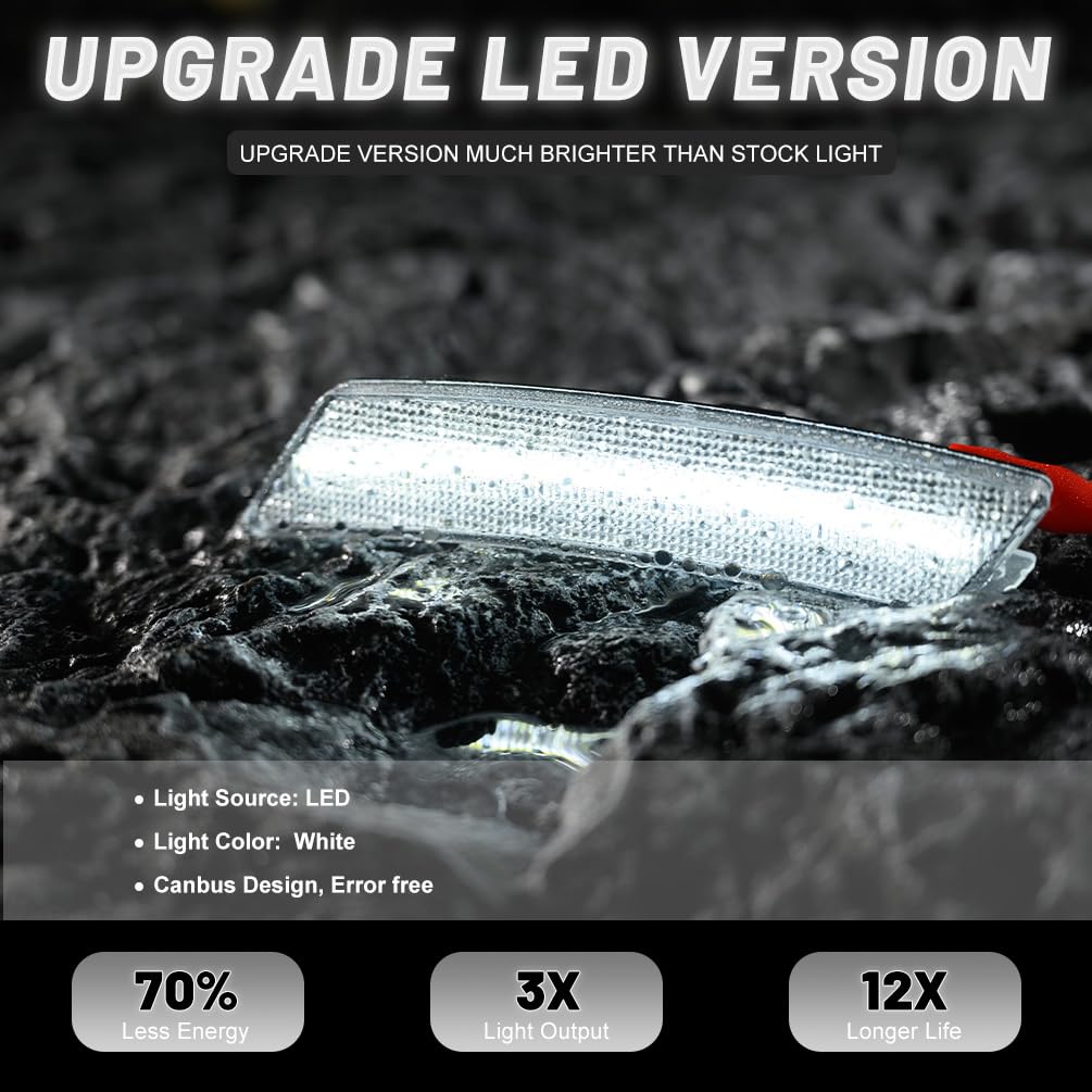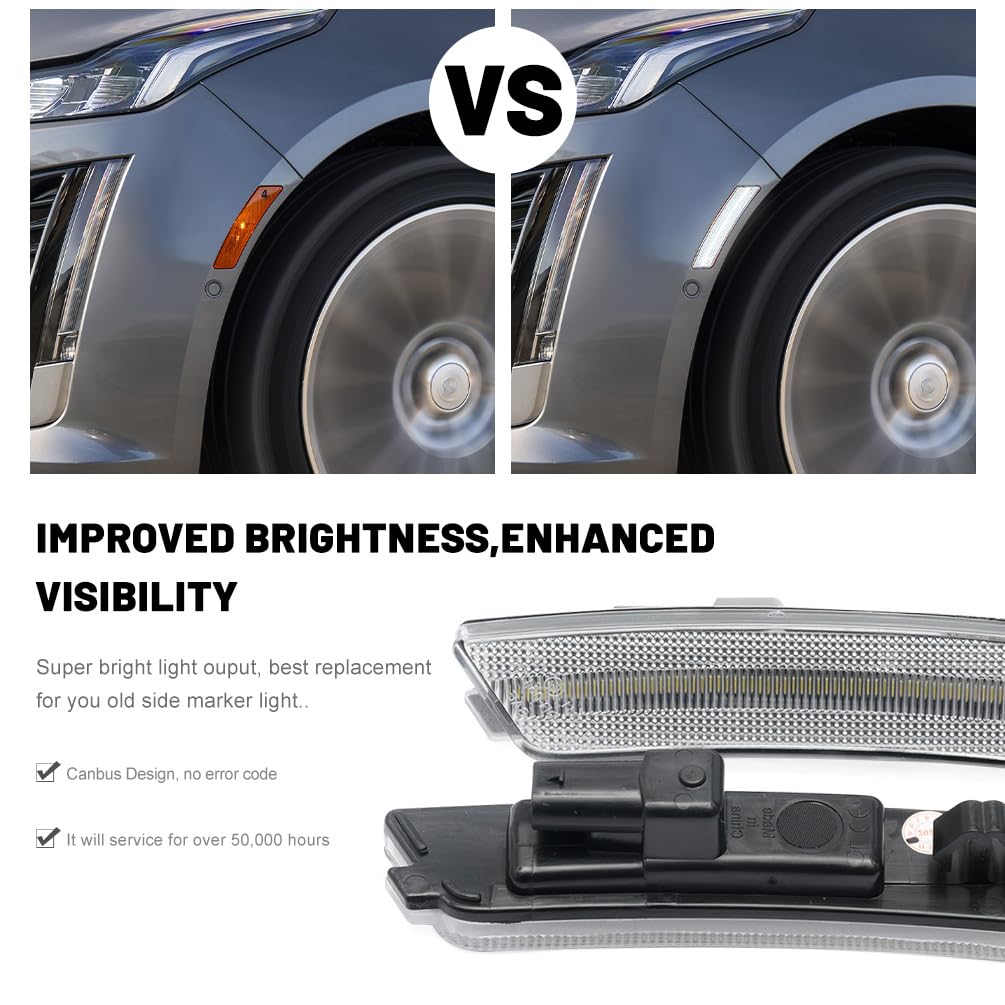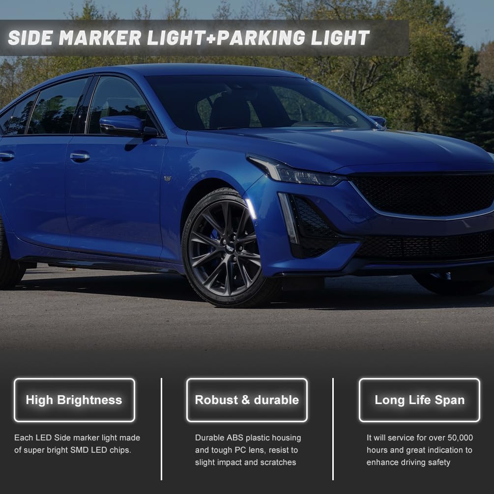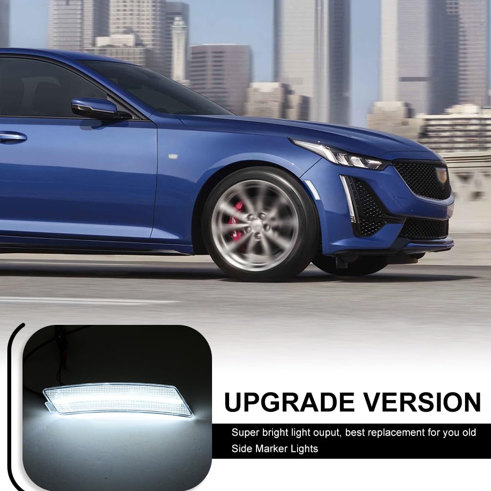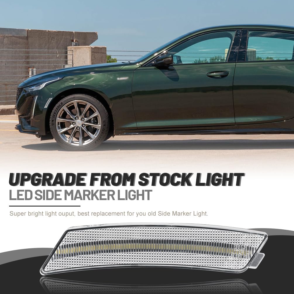 Function: Compatible with 2020 2021 2022 2023 Cadilla.c CT5. Upgrade your CT5 side markers with a new fashion style clear lens look and brighter white LED lighting. Elevates your muscle car's aura and even adds additional safety visibility driving signal features