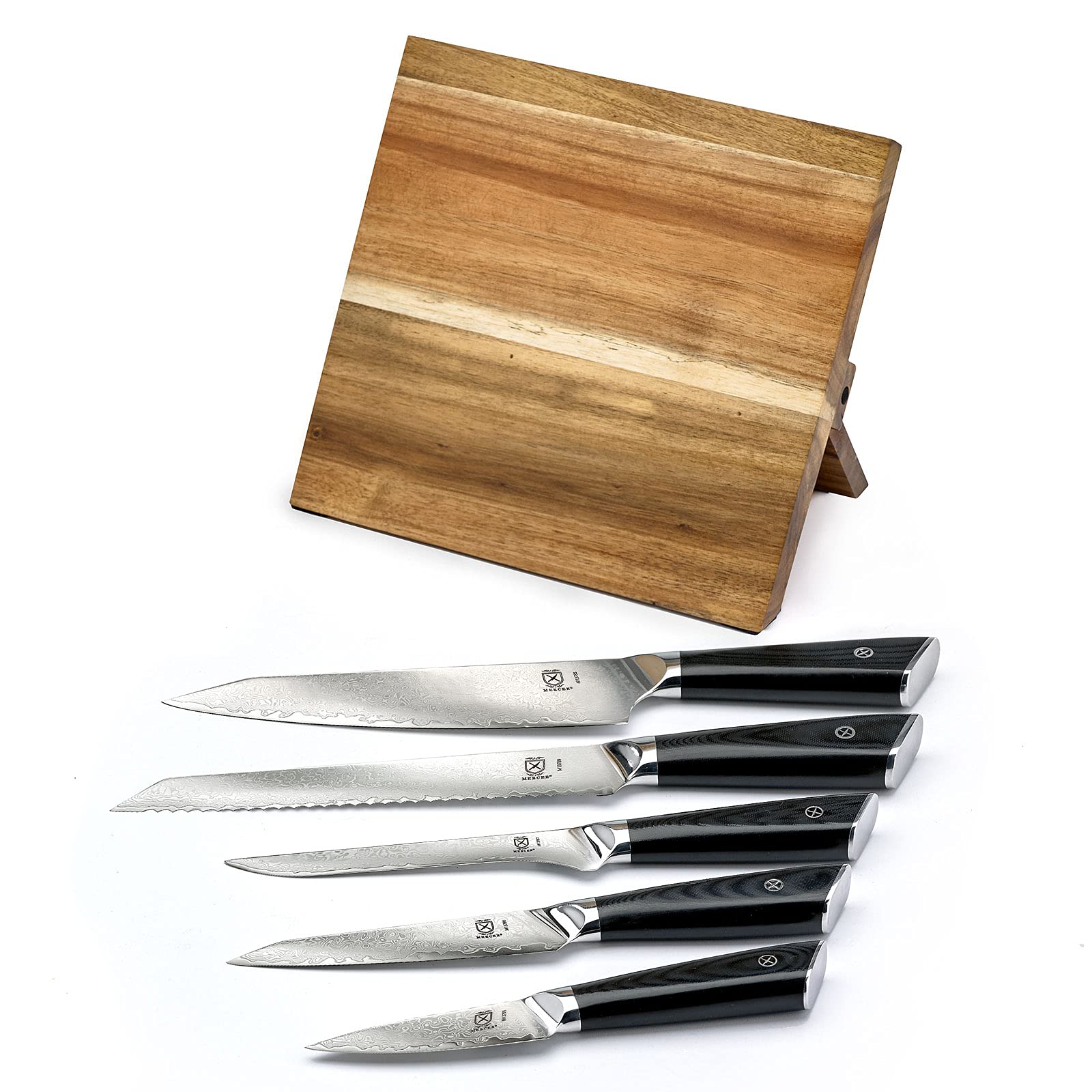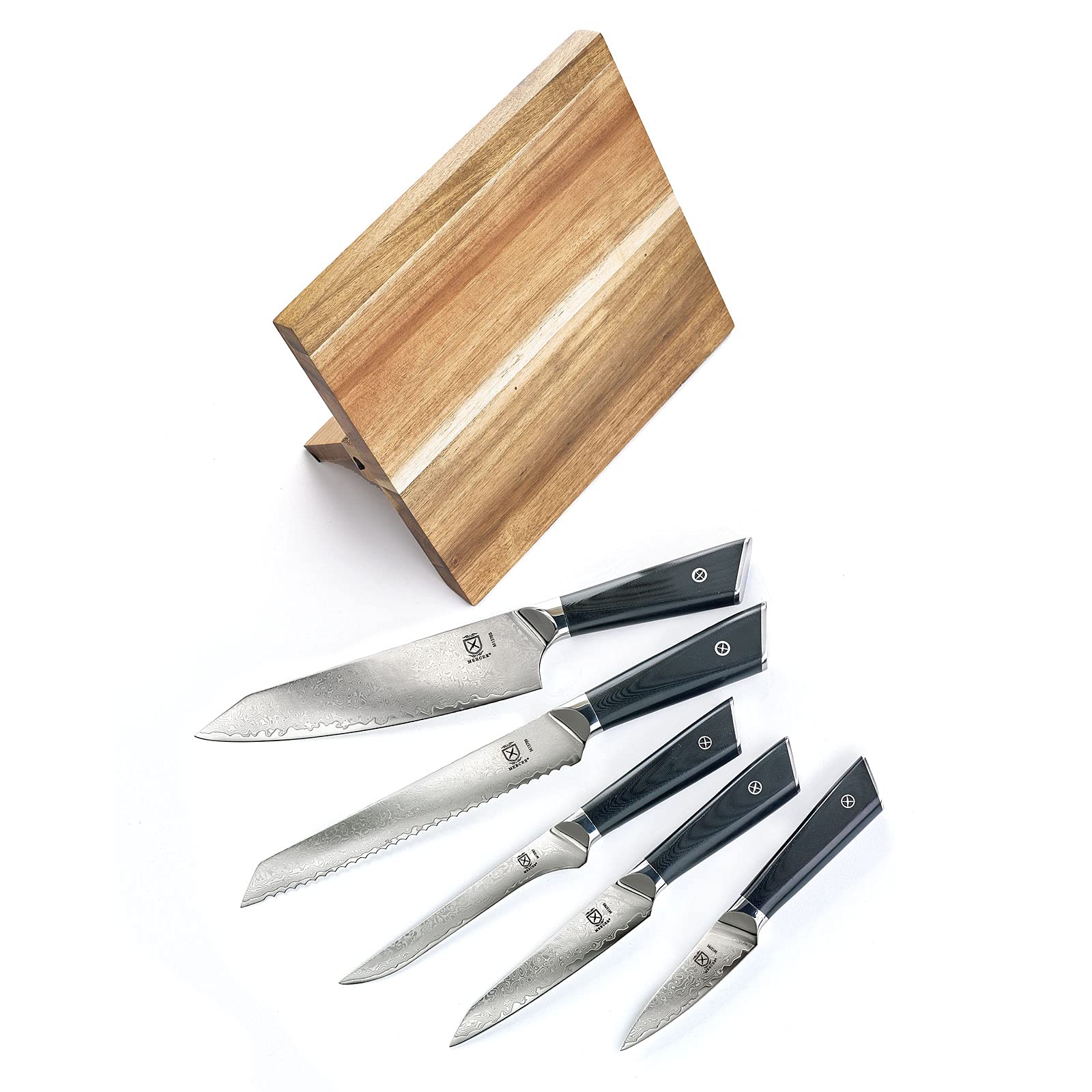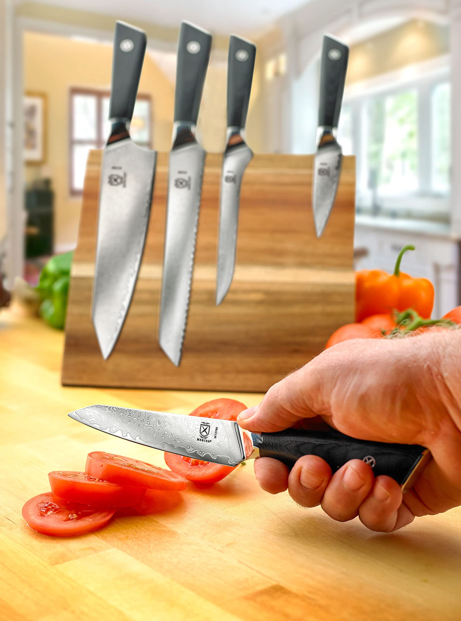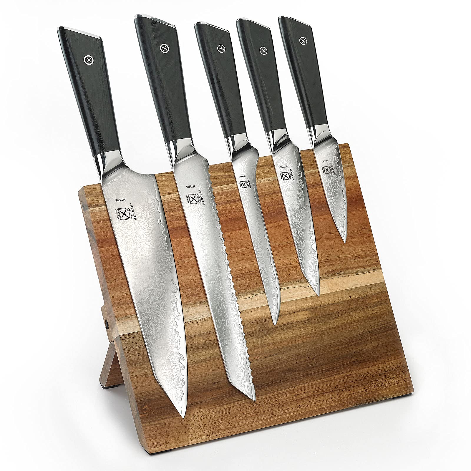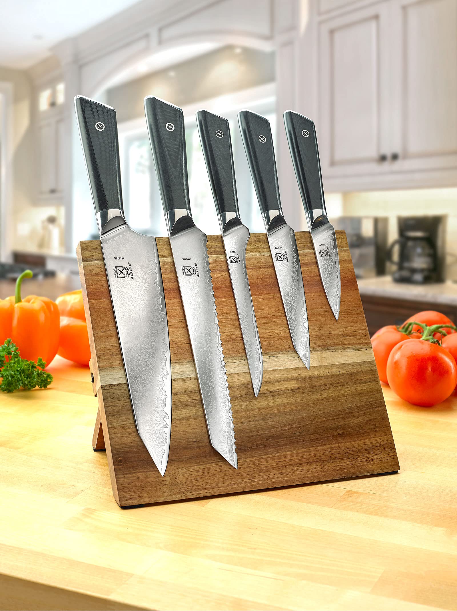 KITCHEN KNIFE SET INCLUDES: 8" Chef's Knife, 8" Bread Knife, 6" Boning Knife, 5" Utility Knife, 3.5" Paring Knife, Magnetic Acacia Wood Board