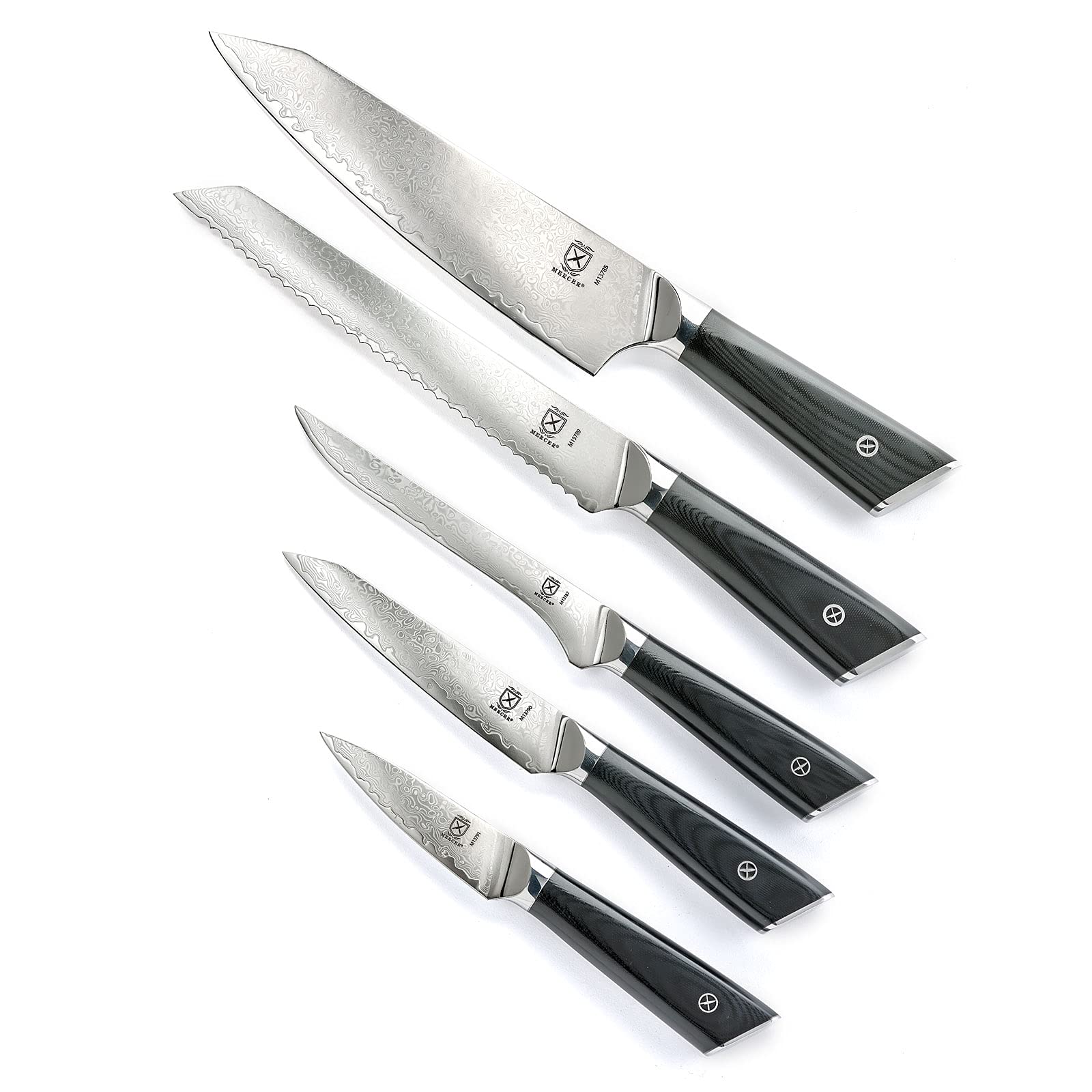 Set includes: 8-Inch Chef, 8-Inch Bread, 6-Inch Boning, 5-Inch Utility, 3.5-Inch Paring Knives, and Magnetic Board. Beautiful Damascus styling clad stainless steel that protects core while maintaining a sharp 15-degree edge. Razor sharp with Rockwell Hardness of 62. Premium ergonomic G10 handle for durability and stability. The shape offers superior hand control and comfort. 1% Carbon, 15% Chromium, 1% Molybdenum, 0.2% Vanadium, and 1.5% Cobalt. Wash by hand and dry with a clean towel after use. Limited Lifetime Warranty.