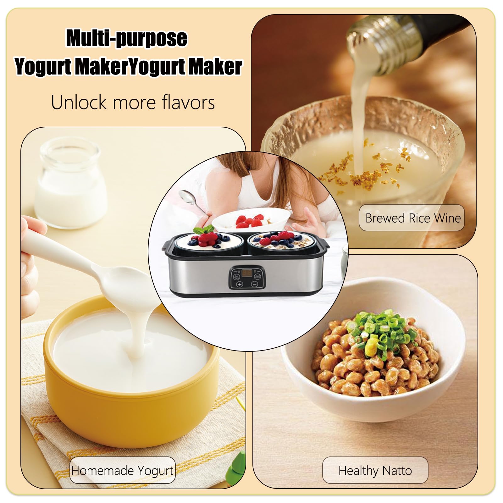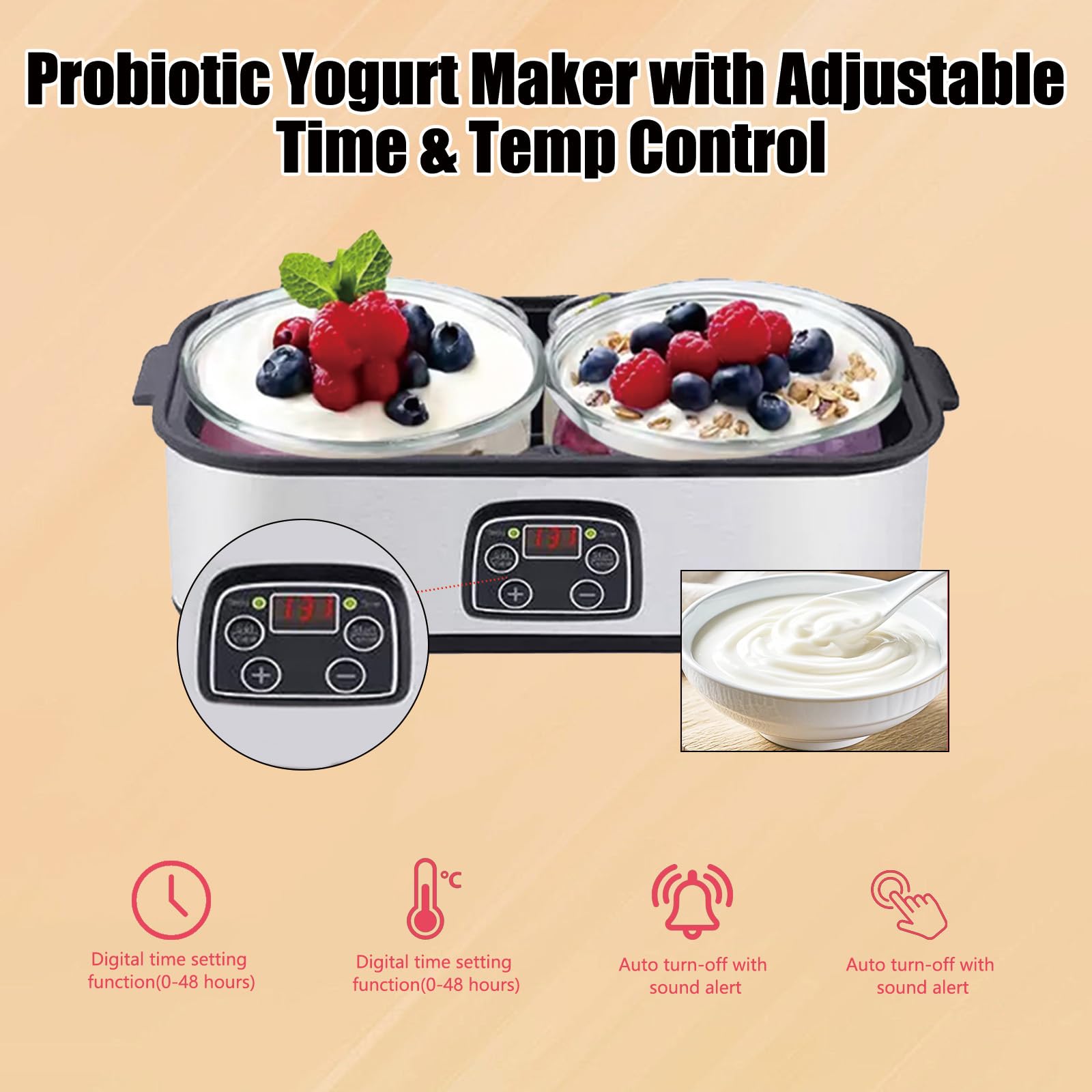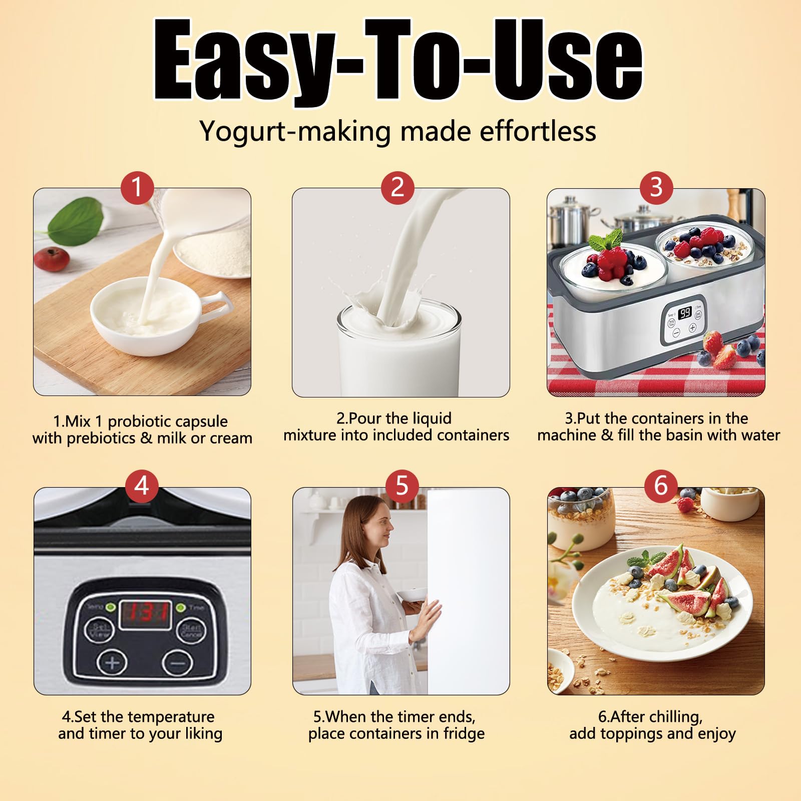 Automatic Operation for Effortless Probiotic Culturing : Simply add milk and starter, set the temperature/time, and let the machine work its magic—no monitoring needed. Produces trillions of live probiotics to support gut health, digestion, energy levels, and overall wellness—far more potent than store-bought yogurt