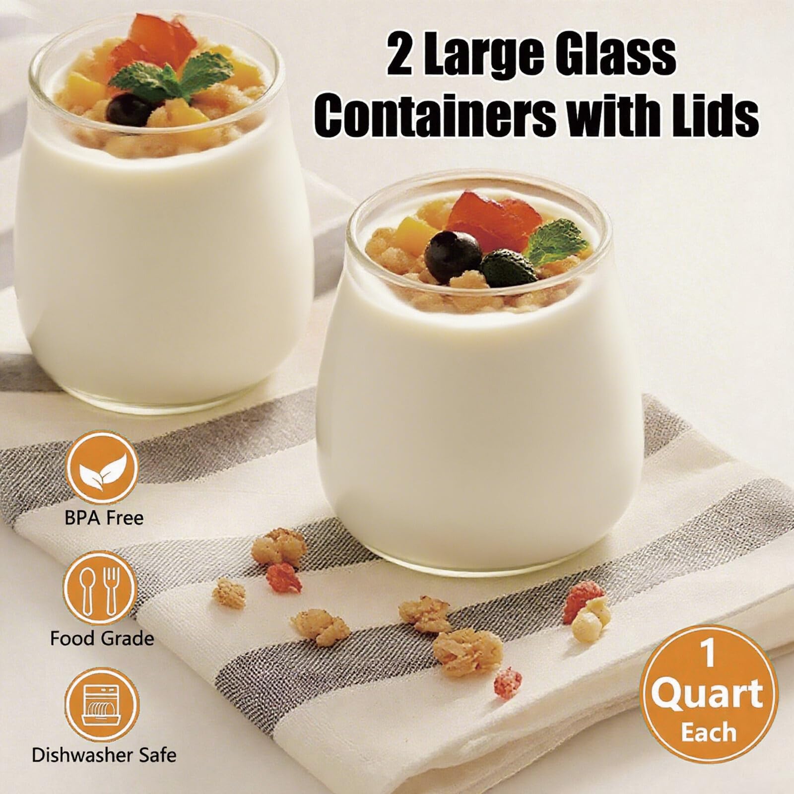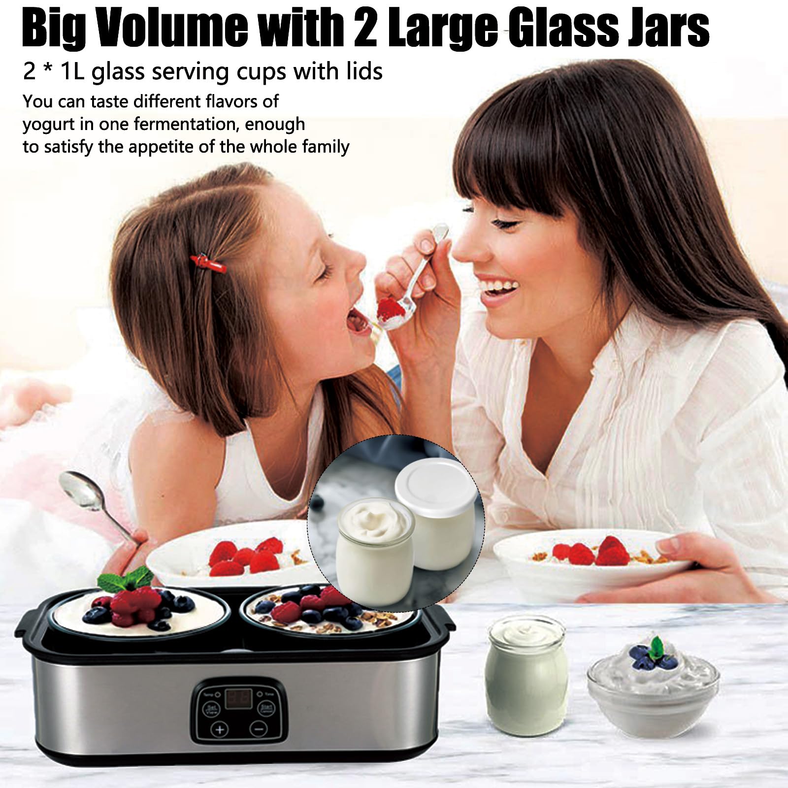 2000ml Batch Capacity for the Whole Family : Two large glass jars hold a total of 2000ml (70 fl oz) of yogurt—enough for 4–6 servings per batch. Perfect for families, meal prep, or stocking up on healthy snacks. Customize with fruit, honey, or granola for personalized flavors