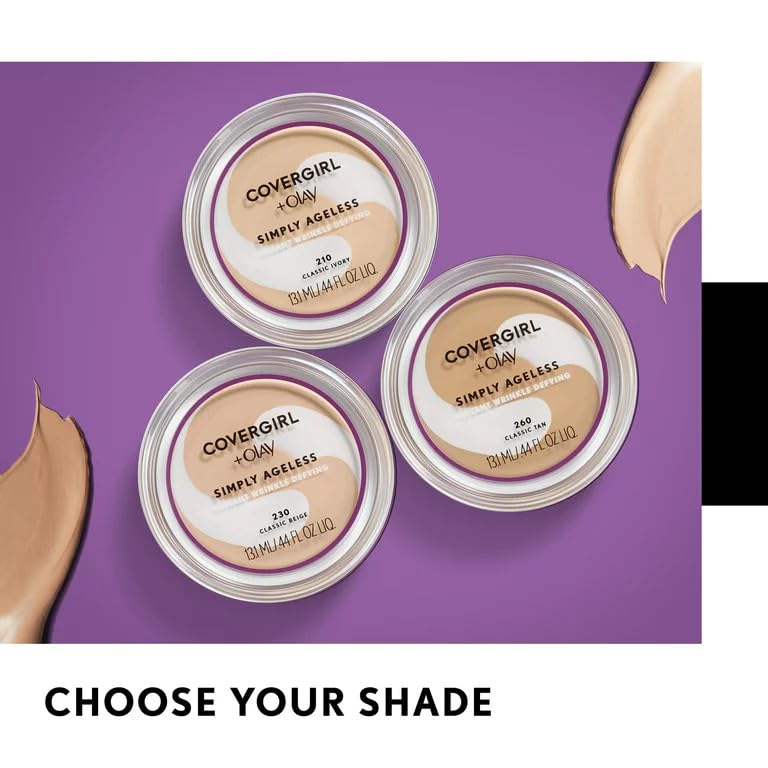 Get amazing skin at any age with COVERGIRL & Olay Simply Ageless Instant Wrinkle Defying Foundation. At the first application, lines & wrinkles seem to disappear for an instantly smooth, simply ageless foundation that could only come from COVERGIRL & Olay.