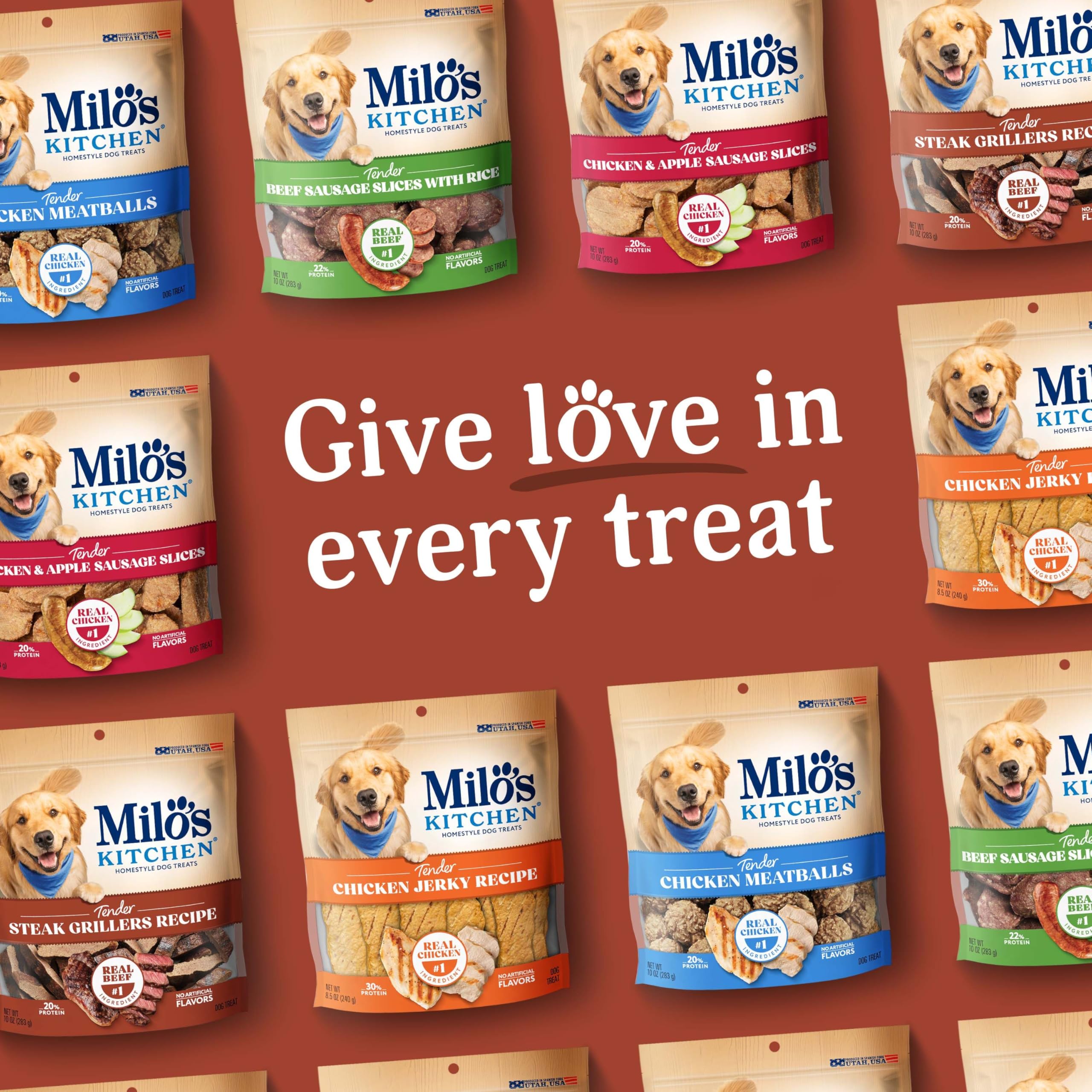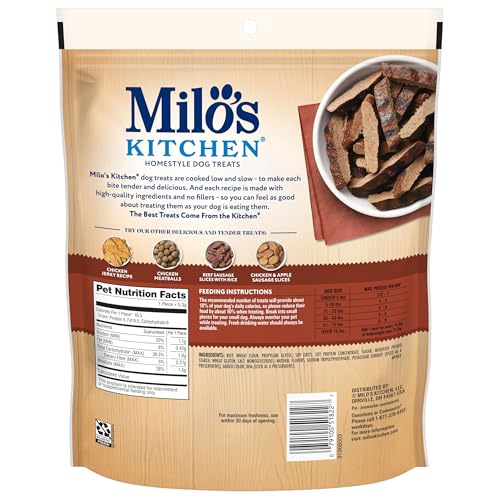 Contains one (1) 18-oz. bag of Milo’s Kitchen Steak Grillers Recipe dog treats