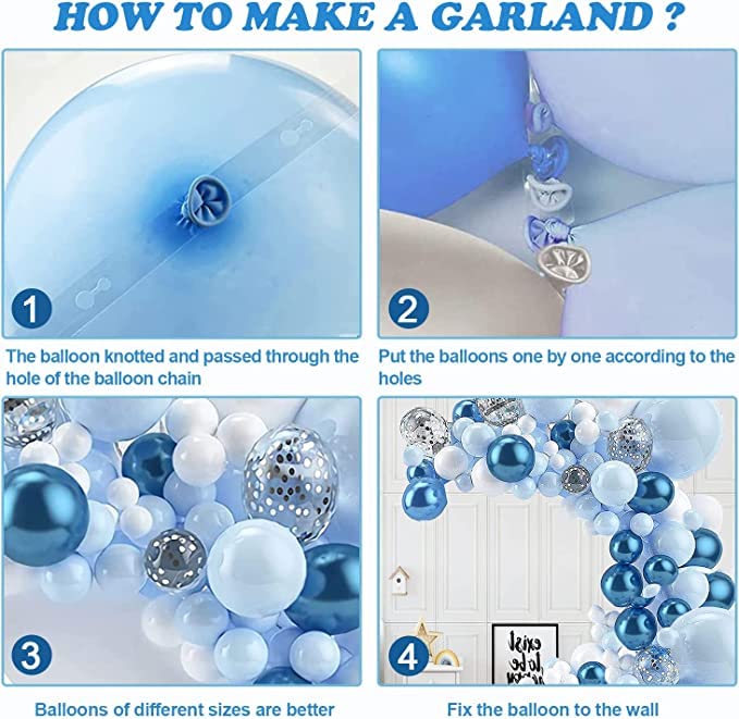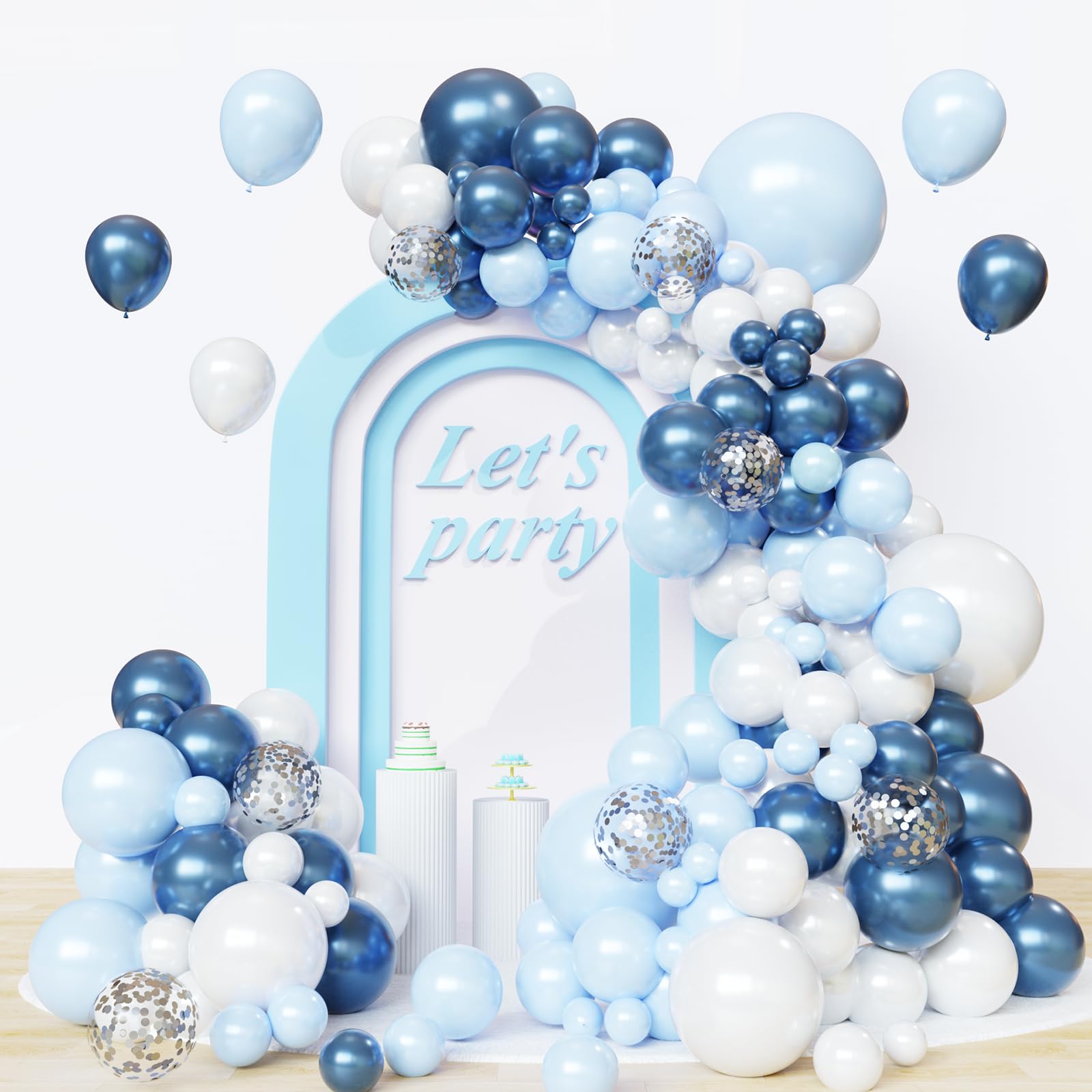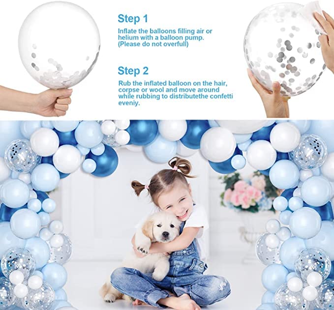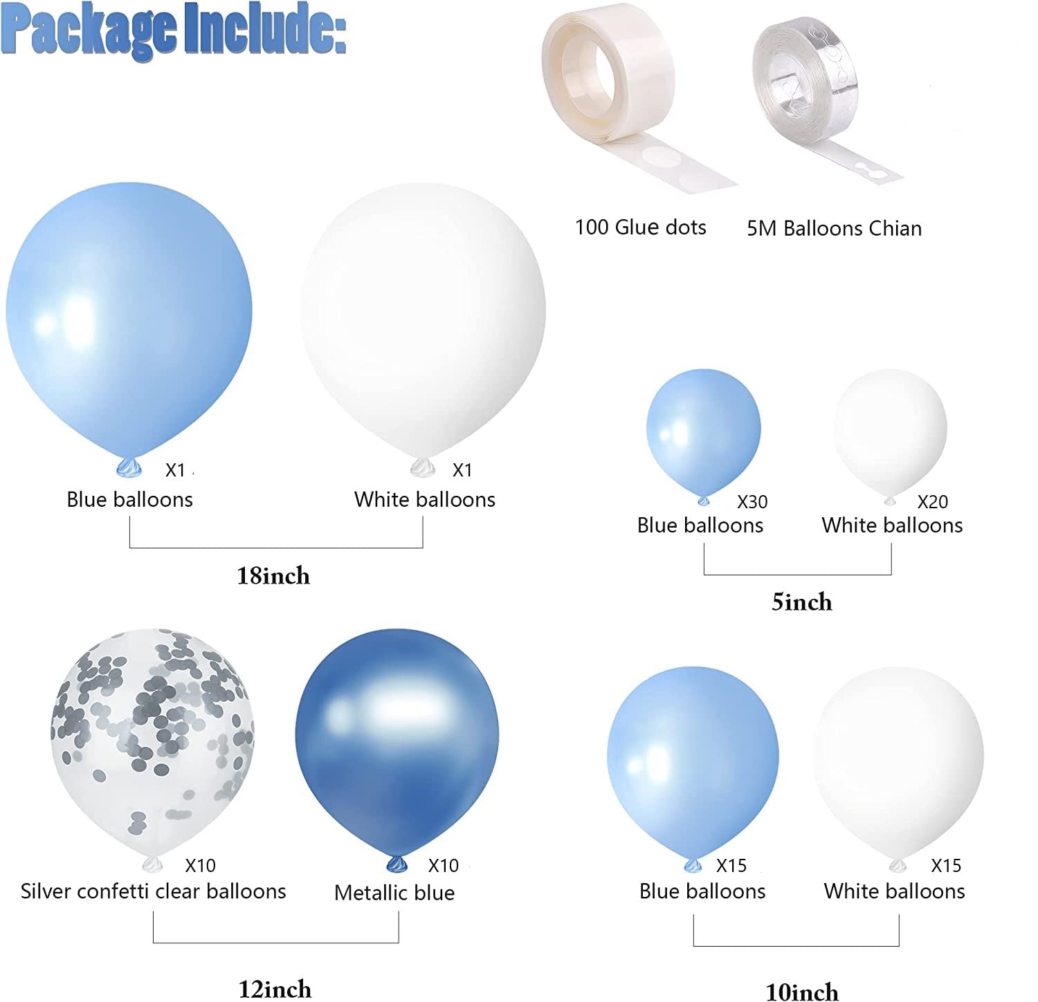 ★102 PCS BALLOON ARCH KIT★: Blue balloon arch kit includes 46 pcs blue balloons(15 pcs 10", 30 pcs 5", 1 pcs 18" ), 36 pcs white balloons(15 pcs 10", 20 pcs 5", 1 pcs 18" ), 10 pcs metallic blue balloons, 10 pcs silver confetti latex balloons, 1 roll of 16ft arch balloon strip tape and 1 roll of 100 points stickers.
