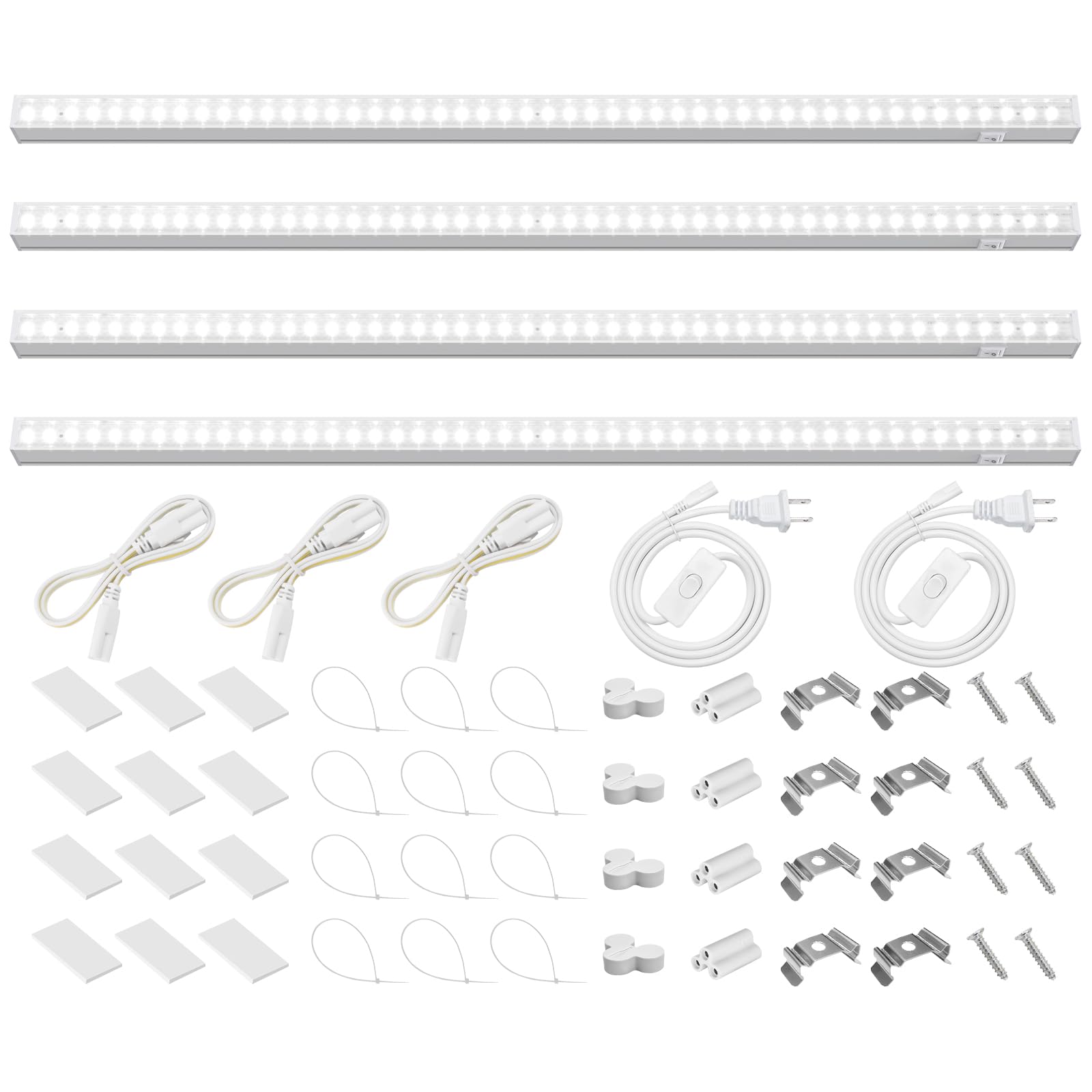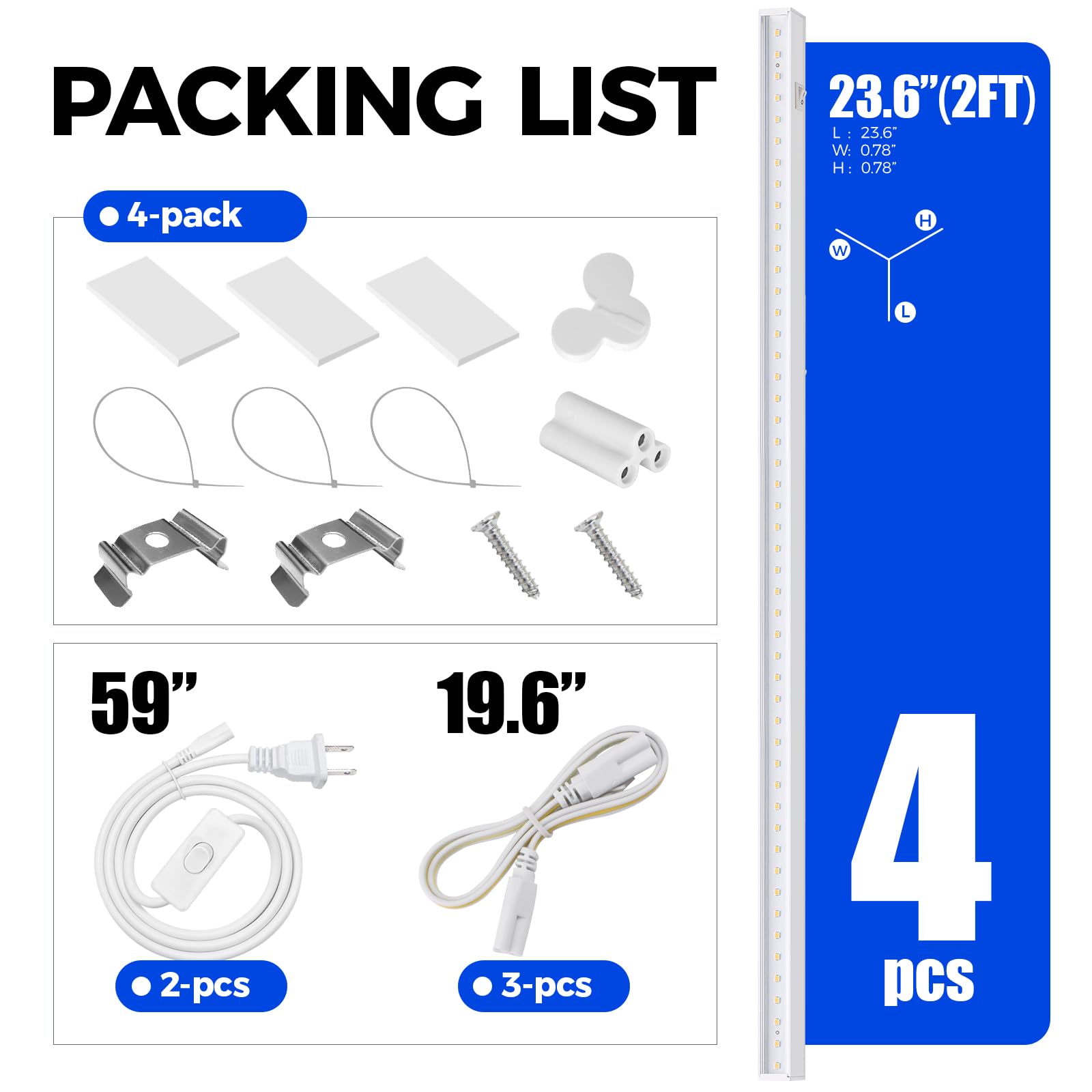 What You Get: 4 x Barrina T5 Grow Lights, 2 x Power Cords with ON/OFF Switch, 3 x Connecting Cords (20''), 4 x Small Connectors, 8 x Installation Clips, 8 x Double-sided Tapes, 8 x Cable Ties, 4 x Dustproof Cap