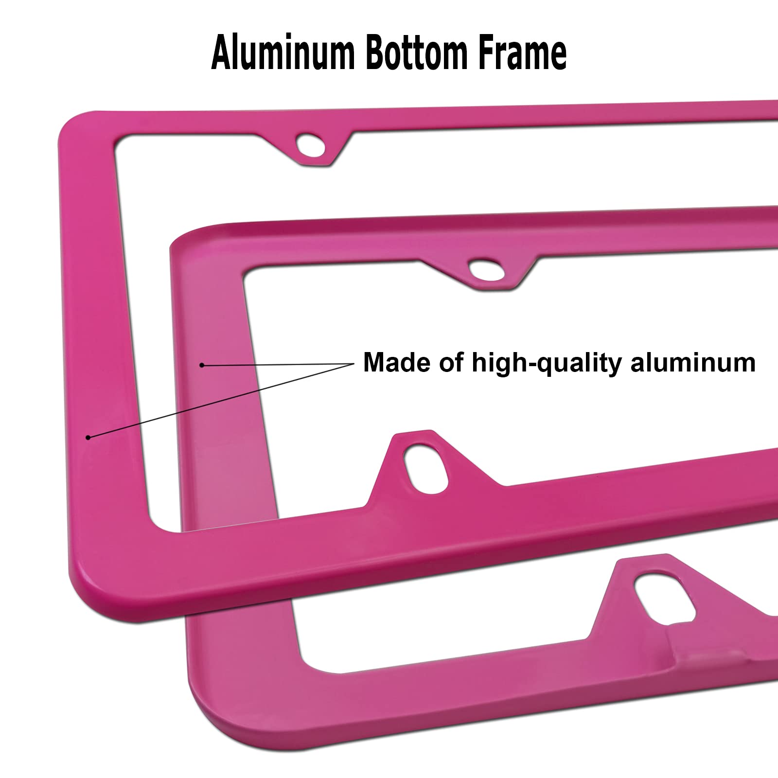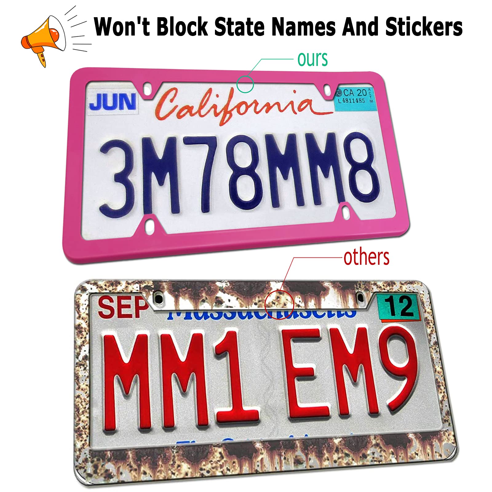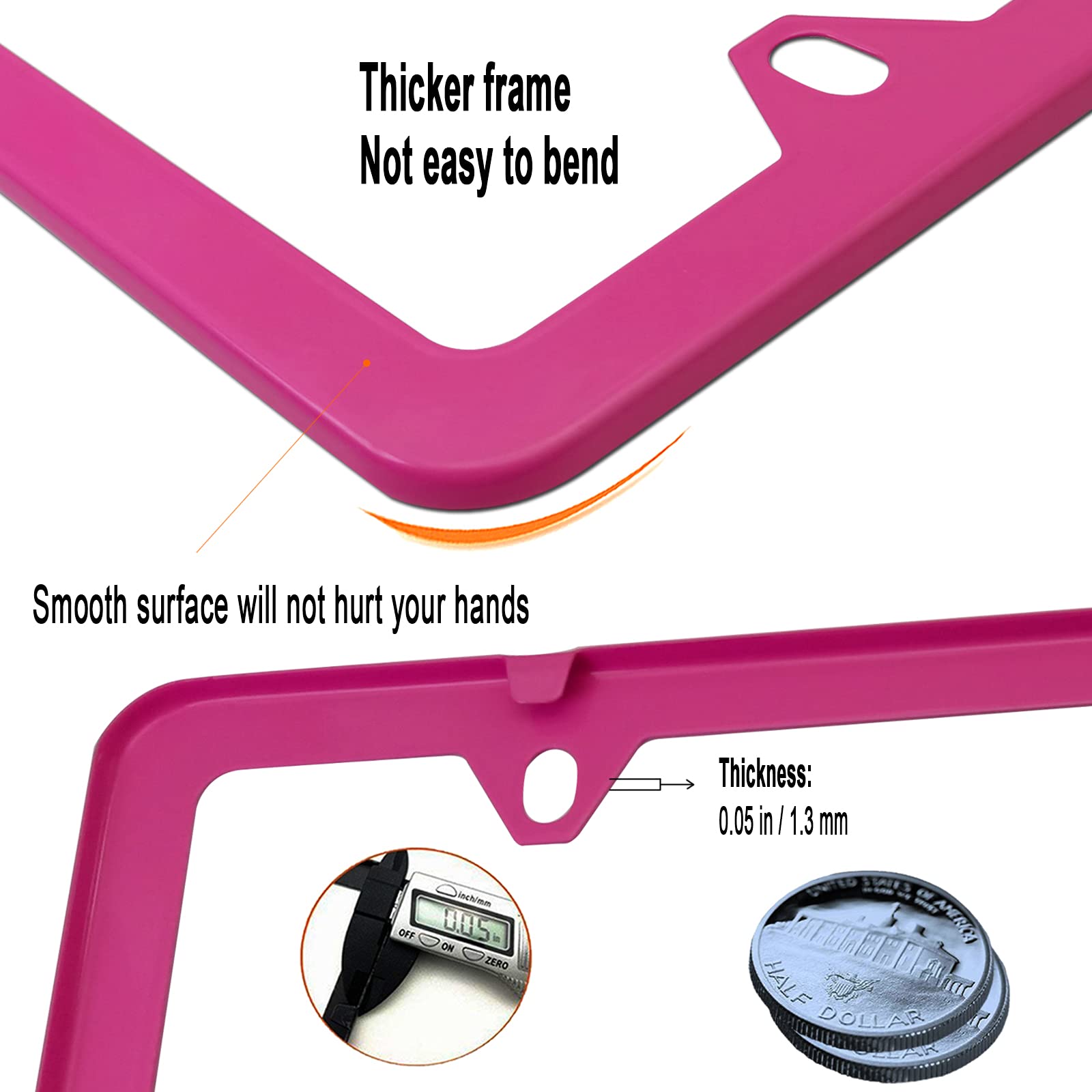 Universal Slim Car Plate Frame: The pink holder uses an aluminum base frame, 1.3mm thick, heavy duty , and will not rust or corrode. Designed for all American 12*6 inch standard license plates, 4 thin edges will not Cover the registration label on the car tag, ensure legal street in all states.