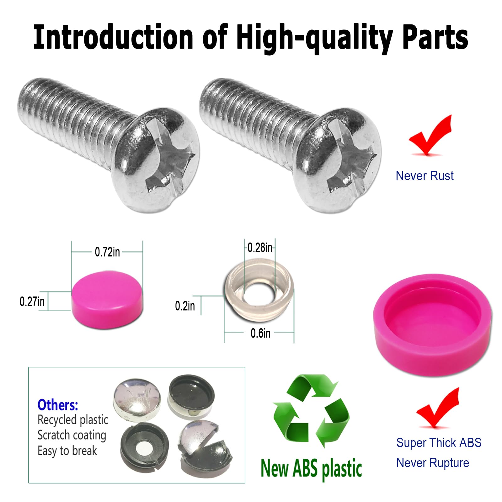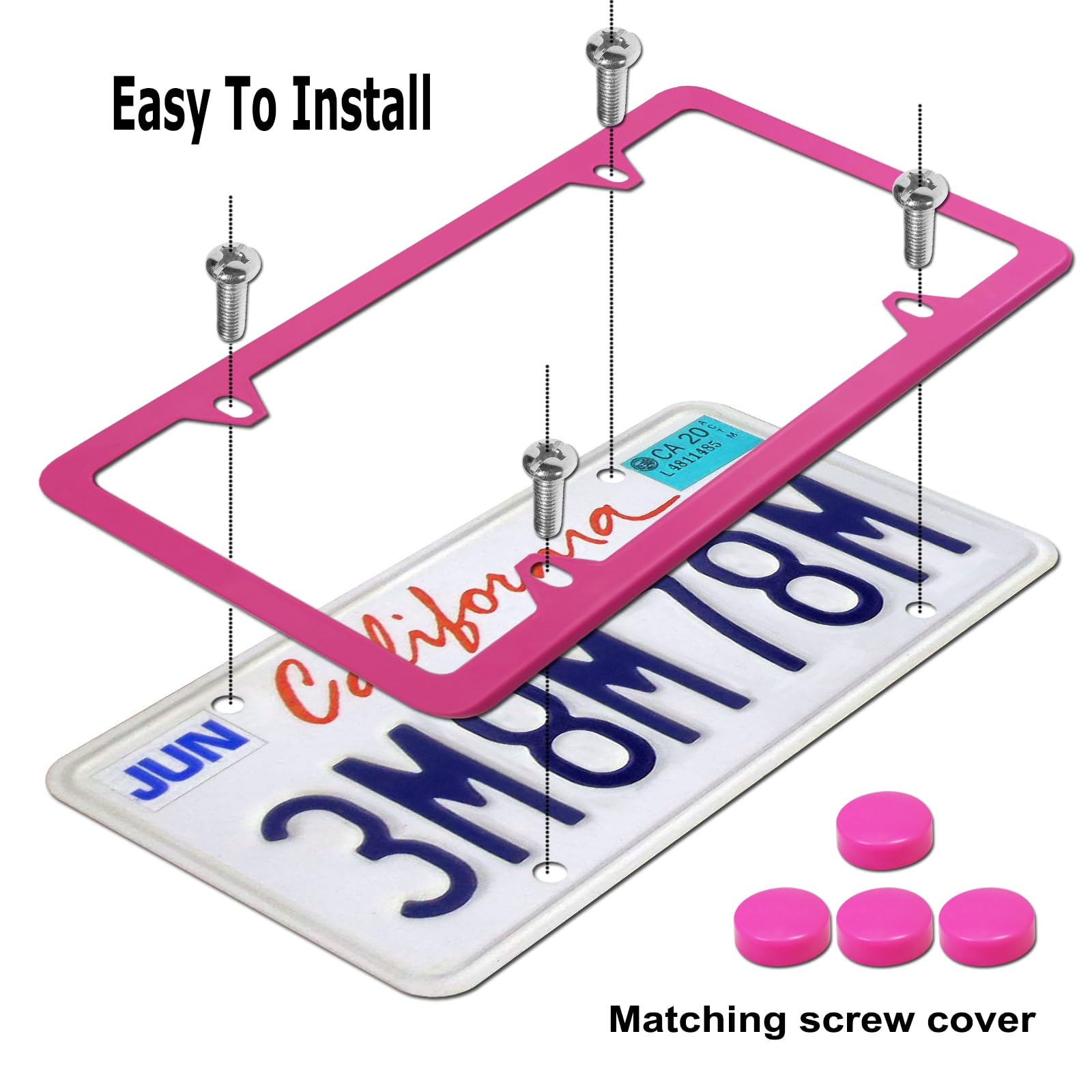 2 PACK PINK LICENSE PLATE FRAMES- The perfect choice to protect and decorate your front and rear license plates! The good gift license plate frame for girl, women, graduates, new car owners or other celebrations! A good choice to make your car stand out in a crowded parking lot and attract attention. The Benefits Of Choosing Our Pink License Plate Holder: Used No-Fade Spray Paint Technology, make the pink powder coating always beautiful for span life on a men/women/girl's car; Made of aluminum alloy, heavy-duty, durable, corrosion-resistant and rust-resistant, thickness of 1.3mm, will not be easily bent and deformed; Designed for all 126 inch standard license plates in the United States; 2 pack frames are suitable for the installation of front and rear license plates; Thin edges will not obscure the registration stickers on the license plate; Contains all license plate mount hardware- stainless steel license plate screws and pink screw cap covers; The black license plate pad can protect the car paint from being scratched by the license plate; 4 pack pink Tire Valve Caps can make your car more personality and shiny. Package Contents: -2 Pink Aluminum Frames -8 Screw Caps and Washers -8 Screws -8 License Plate Pads -4 Tire Valve Covers; Note for personal display bright, contrasting show differences, the picture with the real may have subtle color differences