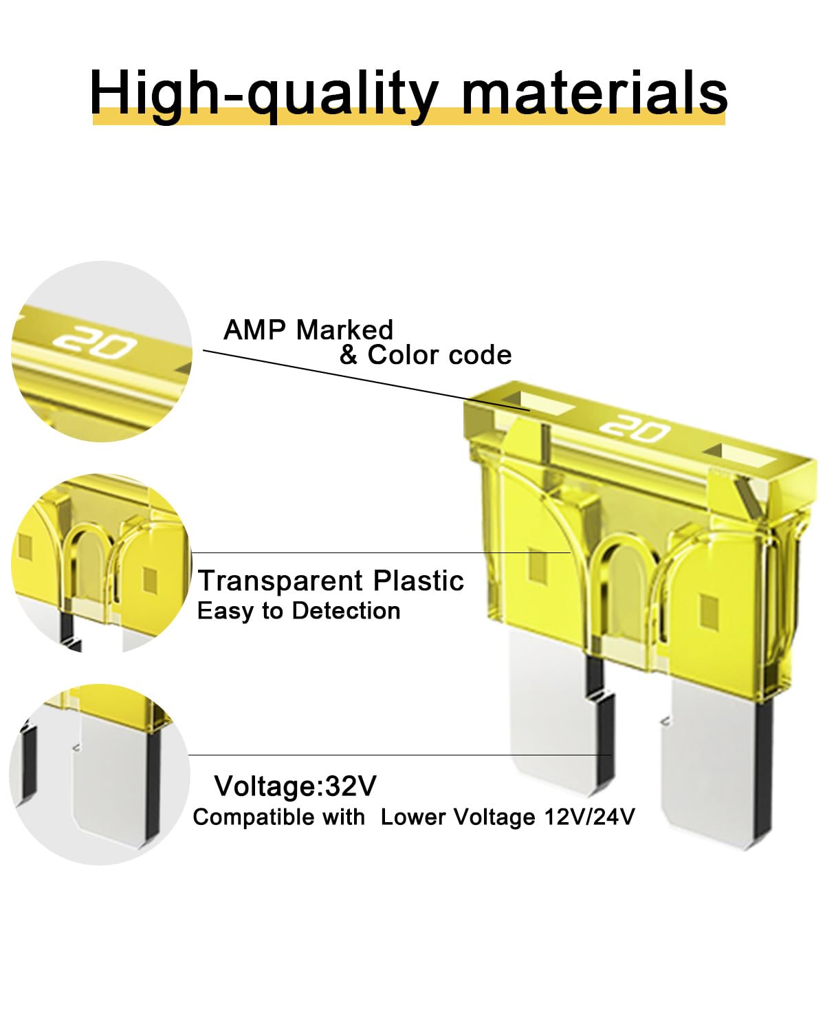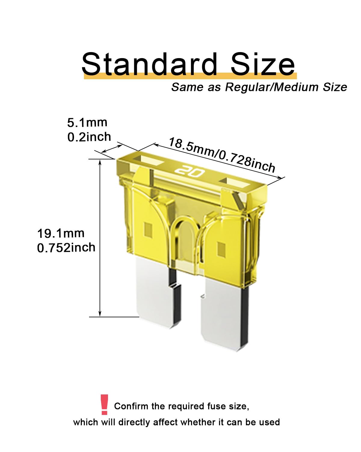 Product Details & Tips - Voltage:32V, Current: 20A, Size: Standard/Regular (This fuse can compatible with lower voltage 12V/24V, but the CURRENT and SIZE must be accurate, Check your desired size and current, which determines whether it can work.)