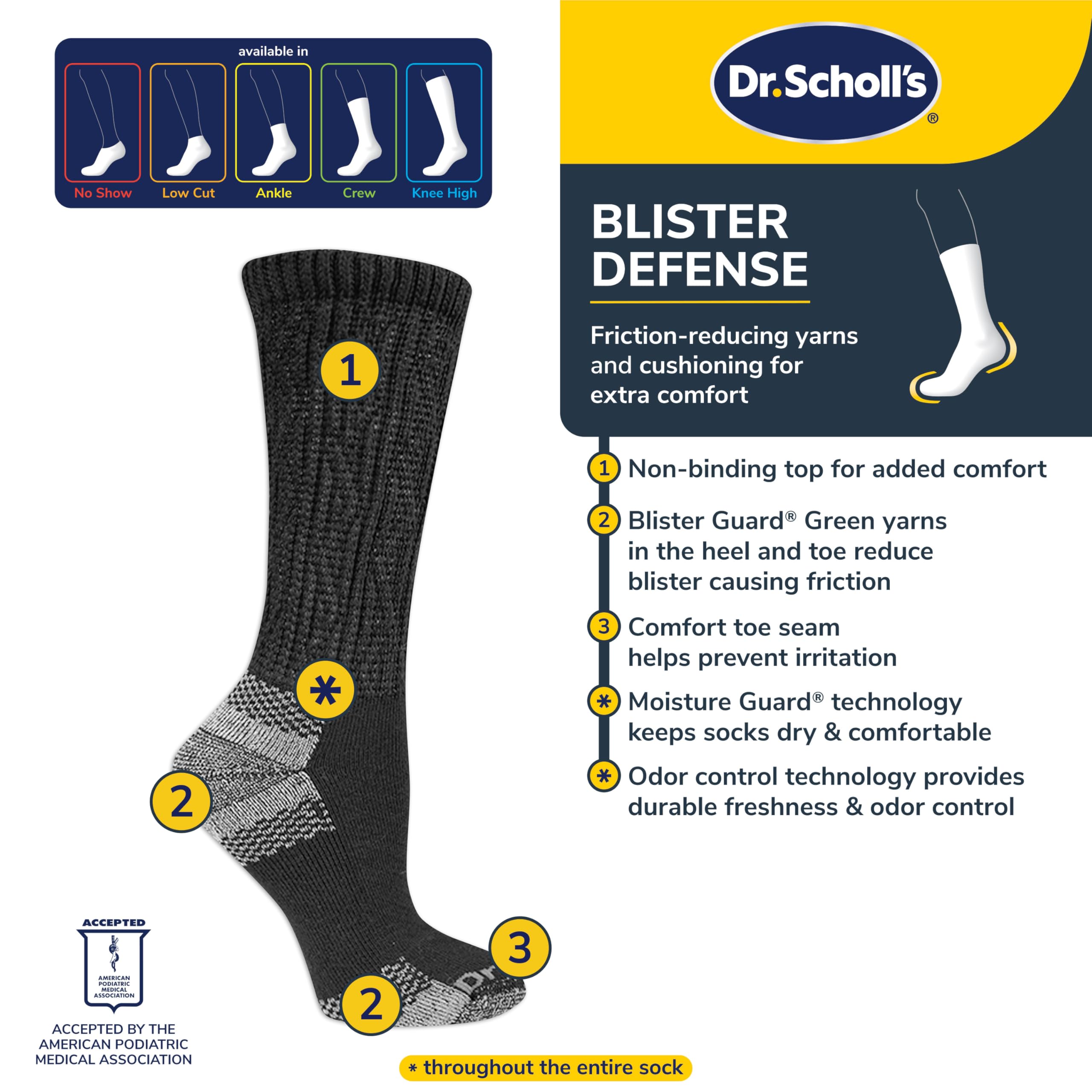 Description Move more comfortably with Dr. Scholl's Women's Advanced Relief Blister Guard® Crew Socks. Integrated with premium technologies like sustainable Blister Guard® Green yarn woven in the heel and toe and softer cushion for increased protection, these crew length women's socks have all the comfort features you expect from a leader in foot health. From the softer, non-binding top that gently conforms to your leg to the smooth, non-irritating toe seam, discover immediate relief from the ground up with this 3-pair pack of socks for women. Available in multiple color choices and shoe sizes to go with your favorite everyday casual footwear. Dr. Scholl’s is a registered trademark of Scholl’s Wellness Company LLC. Manufactured by Renfro Corporation. 611 Linville Road, Mt. Airy, NC 27030. Under license from Scholl’s Wellness Company LLC and its affiliates. All rights reserved.
