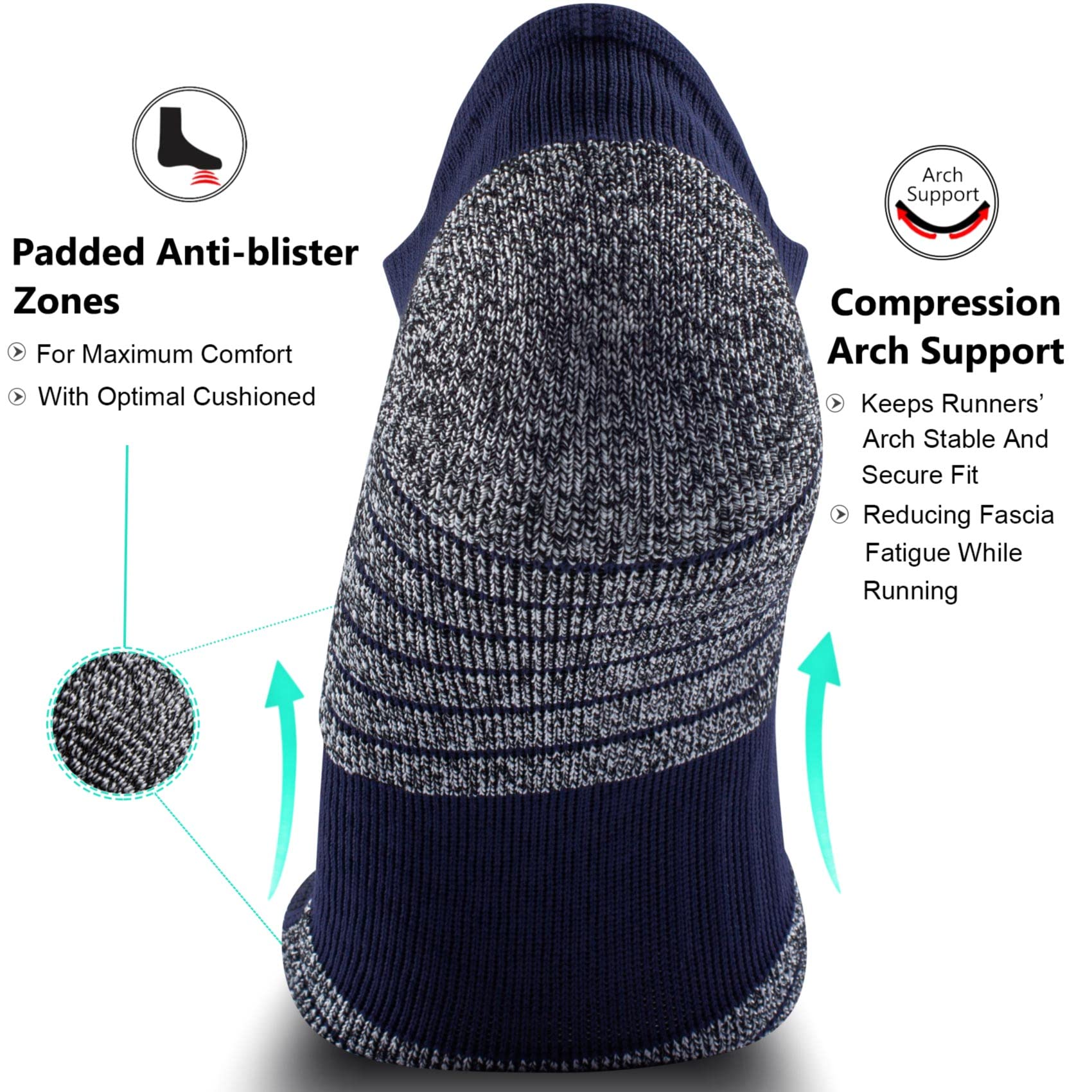Cushioned, Anti-blister and Arch Support: Terry structure socks can absorb impact and relieve foot fatigue to promise no blisters after long time exercise; Durability with power bands made of elastic to hug your foot for maximum support, reducing fascia fatigue in running, hiking, cycling, golf, tennis, yoga, gym and other sports