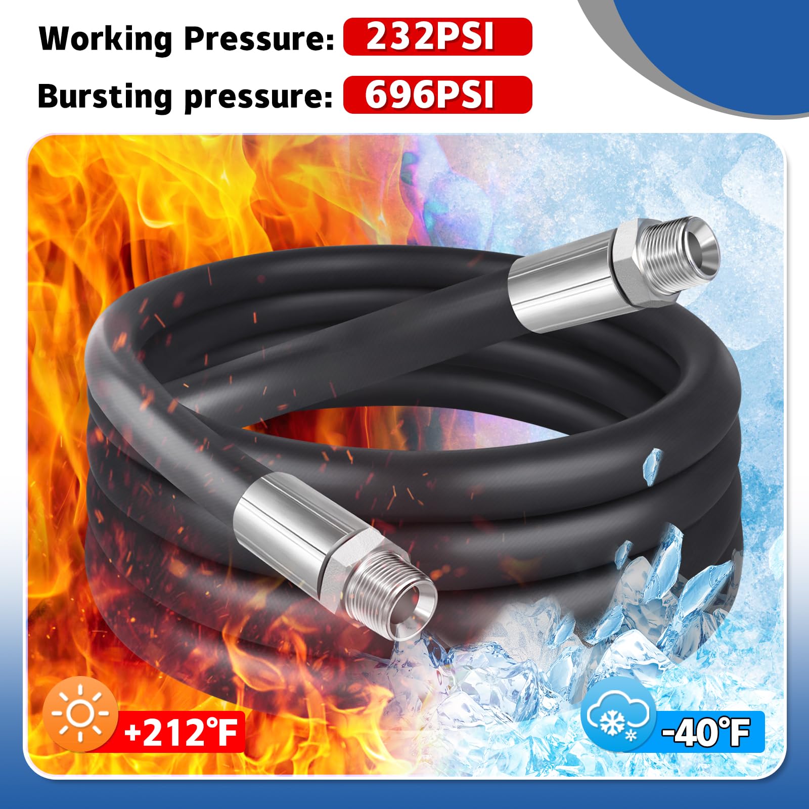 【Size and Specification】The hose has a length of 6 feet and a connector of 1 NPT, making it suitable for transferring fuel efficiently. Working Pressure: 232PSI. Bursting pressure: 696PSI. Working Temperature Range: -40 °F - 212 °F.