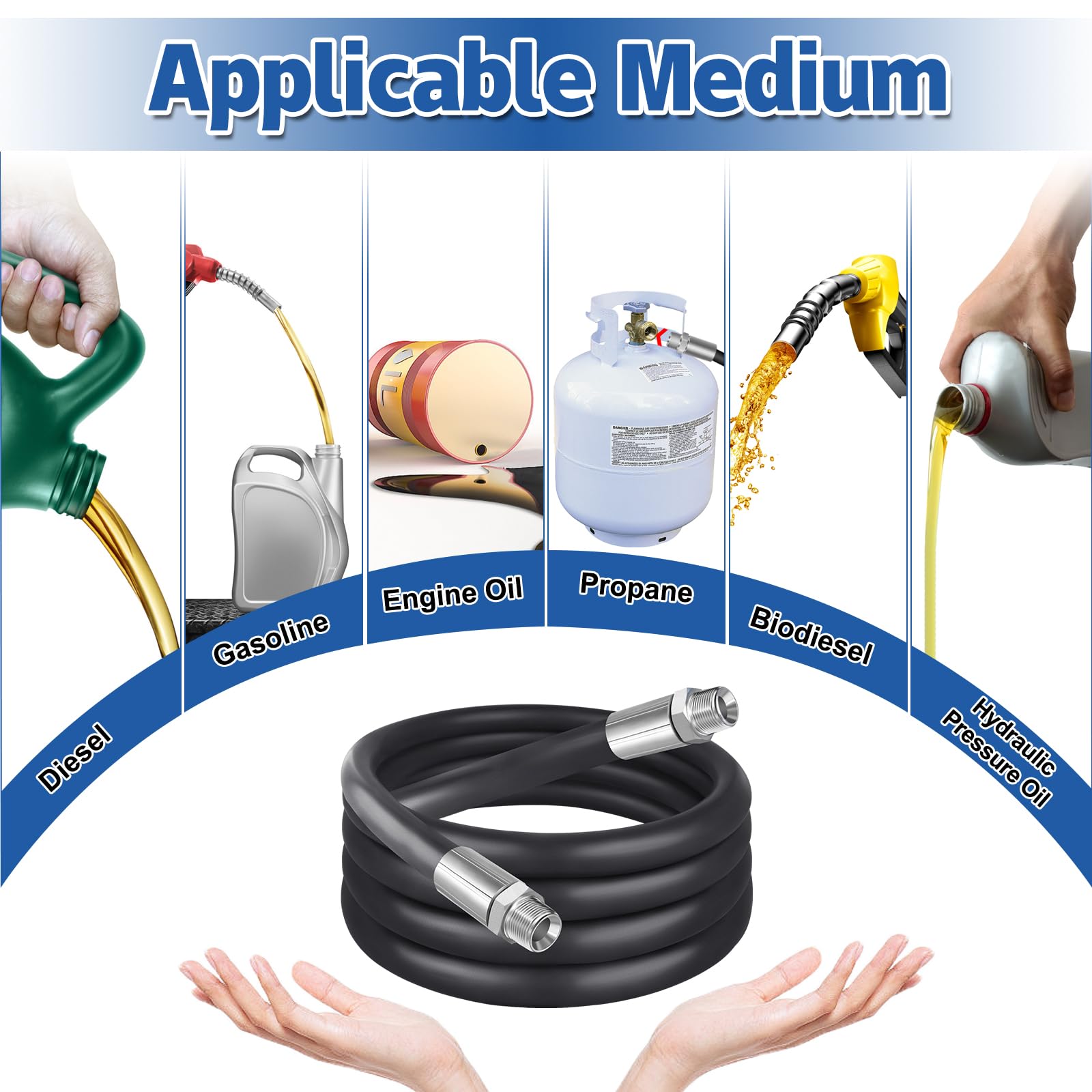 【Compatibility】Fuel dispensing hose compatible with multiple liquids,such as diesel,gasoline,propane,kerosene,B-20 biodiesel,E15 ethanol,biodiesel,grease,E85E100,E10,mineral spirits, petroleum,oils, biodiesel,etc.