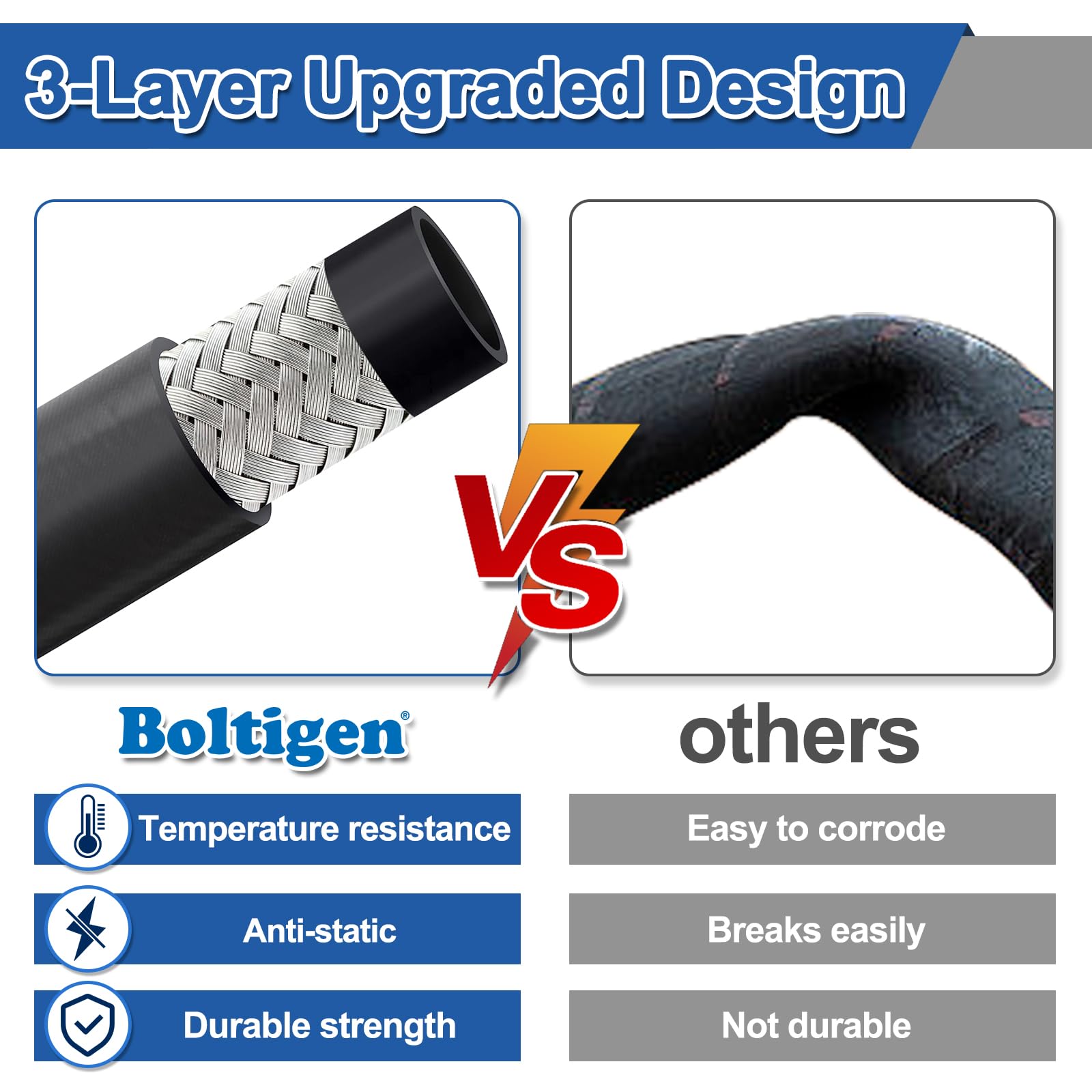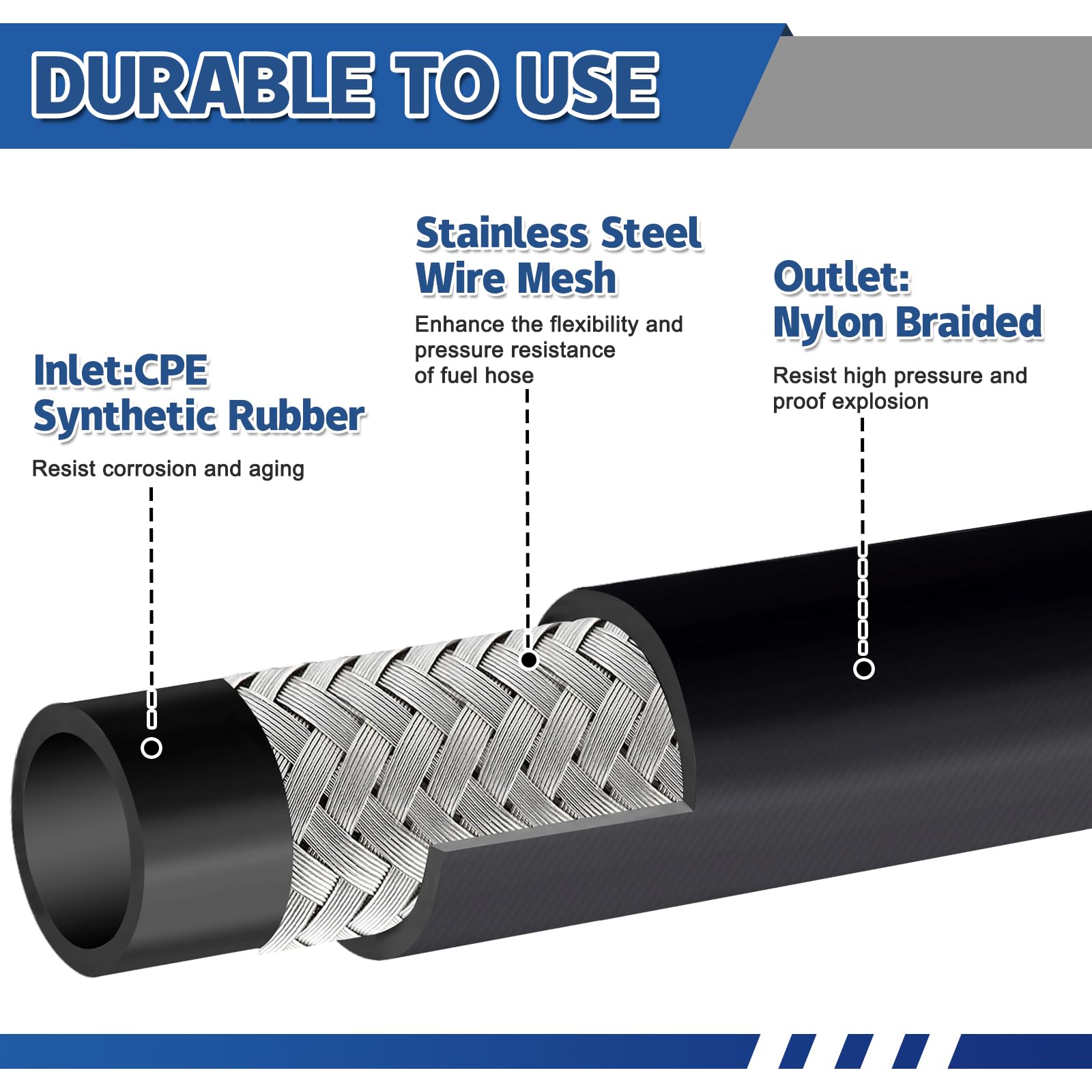 【3 Protective Layers】Nitrile rubber inner, stainless steel braid in the mid, PVC and Nitrile blended rubber outer, this fuel transfer hose is designed to withstand the effects of various fuels and fluids. The rubber material offers excellent durability, flexibility, and resistance to abrasion, ensuring a long service life even when exposed to harsh conditions.