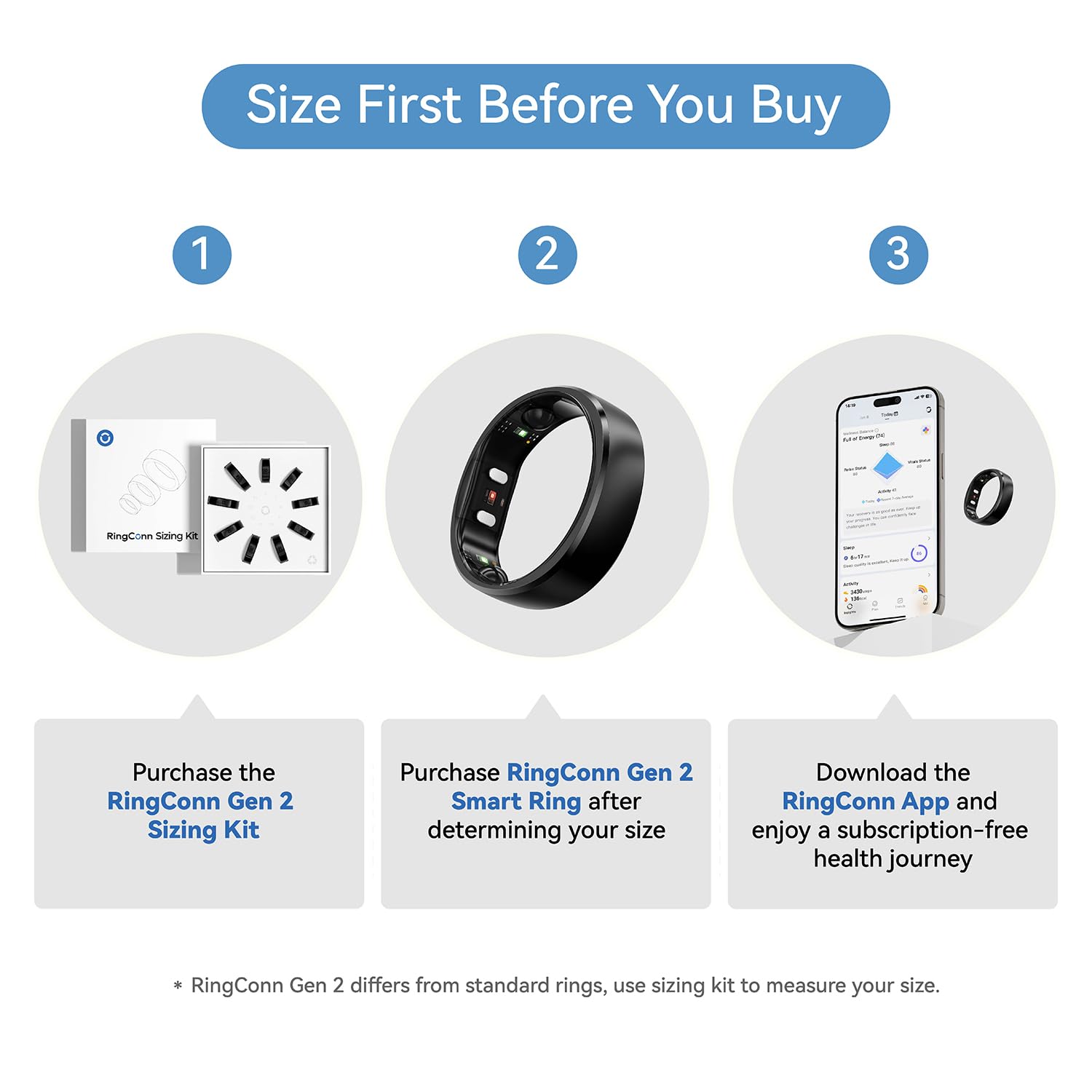 [Size Before You Buy] RingConn Gen 2 Smart Ring uses unique sizing standards, different from U.S. and other health rings. RingConn Gen 2 Sizing Kit helps you find the most comfortable and accurate fit for your finger, preventing the inconvenience of returns and exchanges by ensuring you select the correct size before purchasing