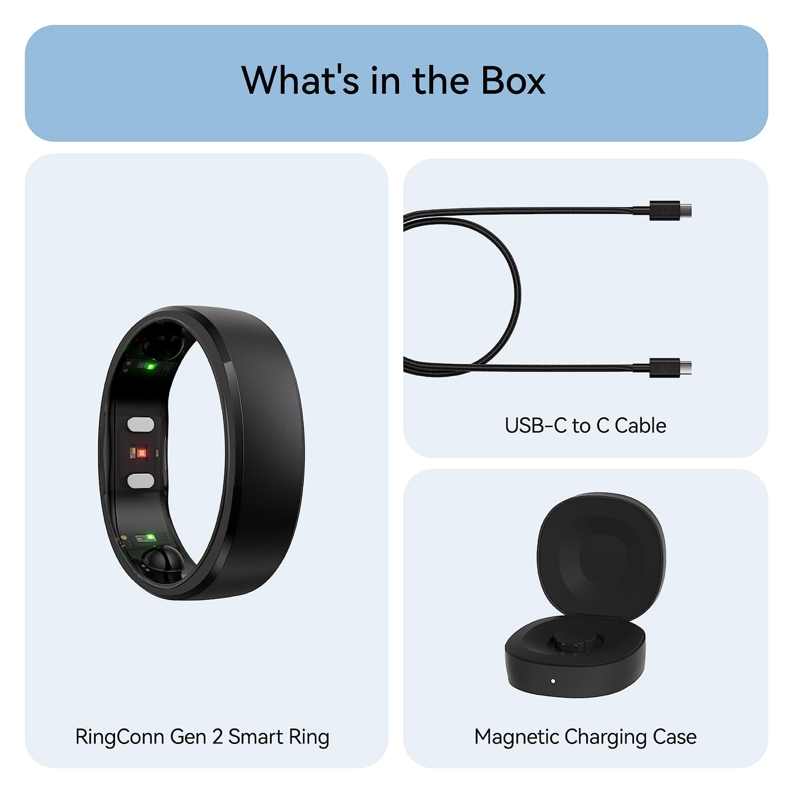 [What You Get] RingConn Smart Ring *1, Charging Case *1, USB-C to USB-C cable (1m / 3.3ft) *1, user manual *1, 12-month warranty, and our friendly customer service