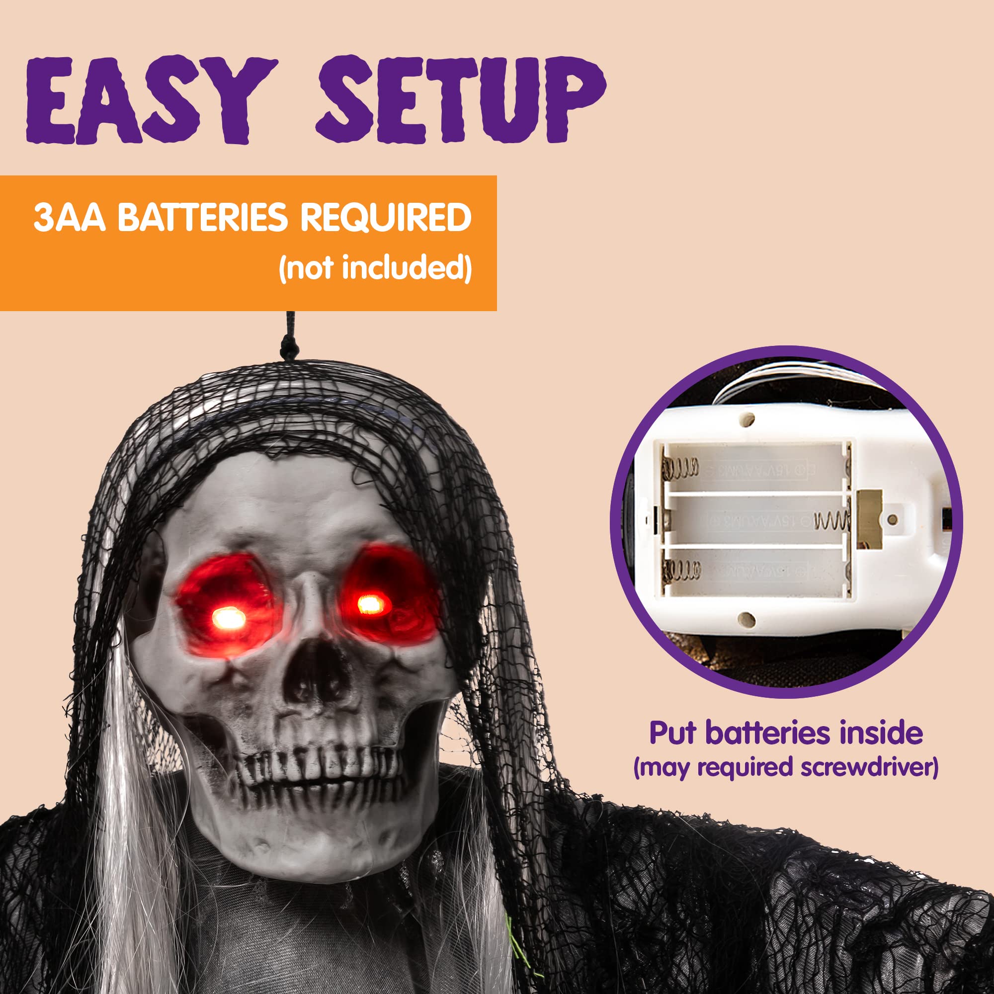 SUPER VALUE. Our 1 pack Hanging Grim Reaper is designed with glowing eyes, sound effects, shaking function, and voice control. The size of this Grim Reaper is 59 inches. It is easy to be noticed, perfect for your spooky halloween theme!