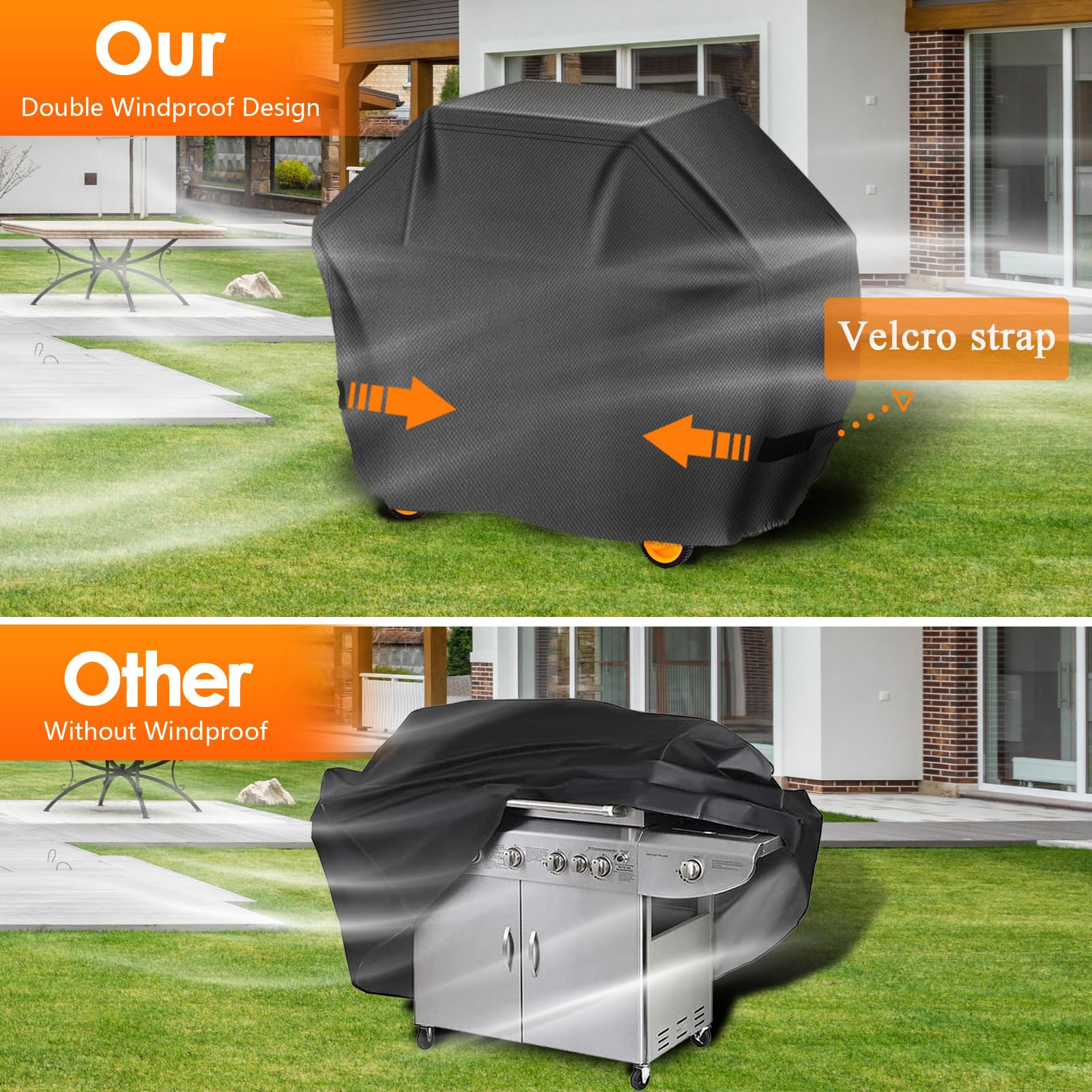 【Waterproof & Snowproof & Anti-UV】- Made of upgraded fabric,the barbeque grill cover exhibits superior colorfastness, resists UV, repels rain, resists tears and cold cracking, durable and long-lasting, gives your grill all year round protection against sun, rain, snow, hail, wind, dust, dirt and etc.