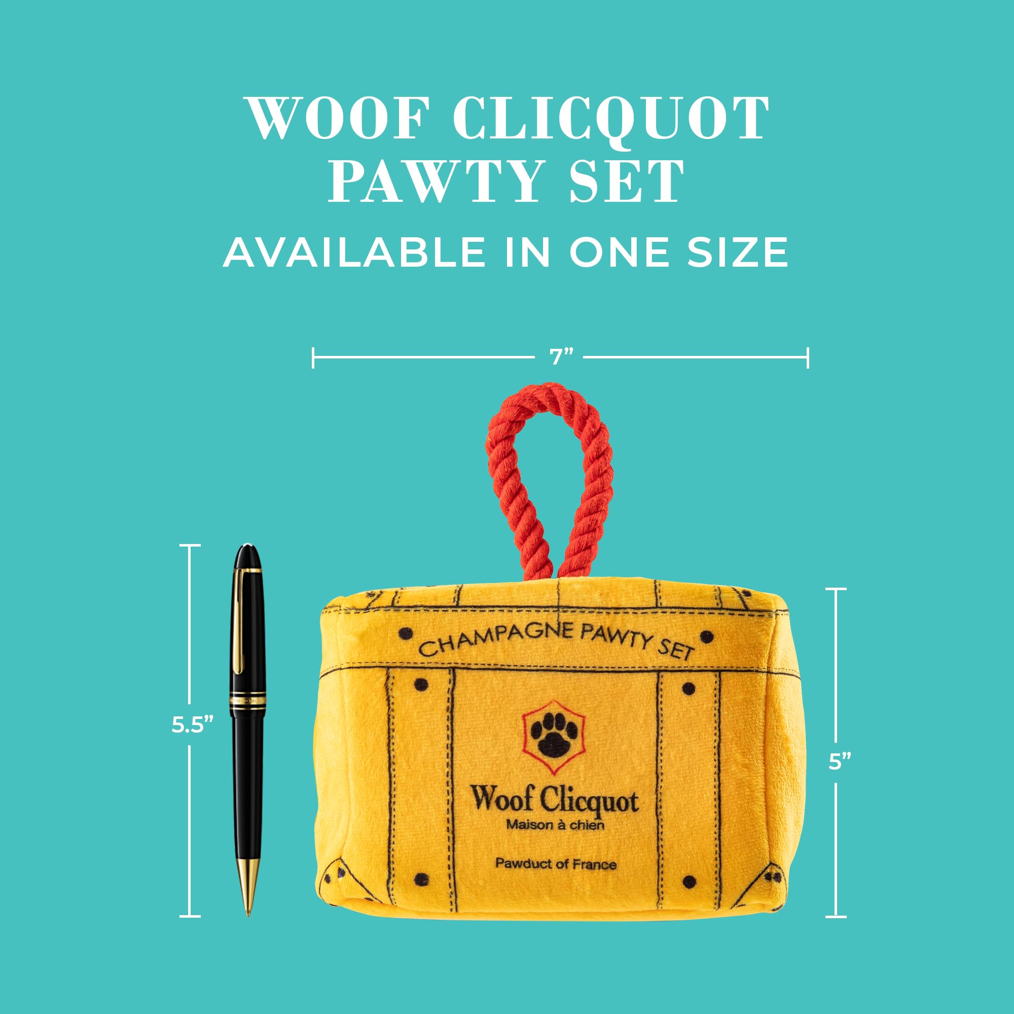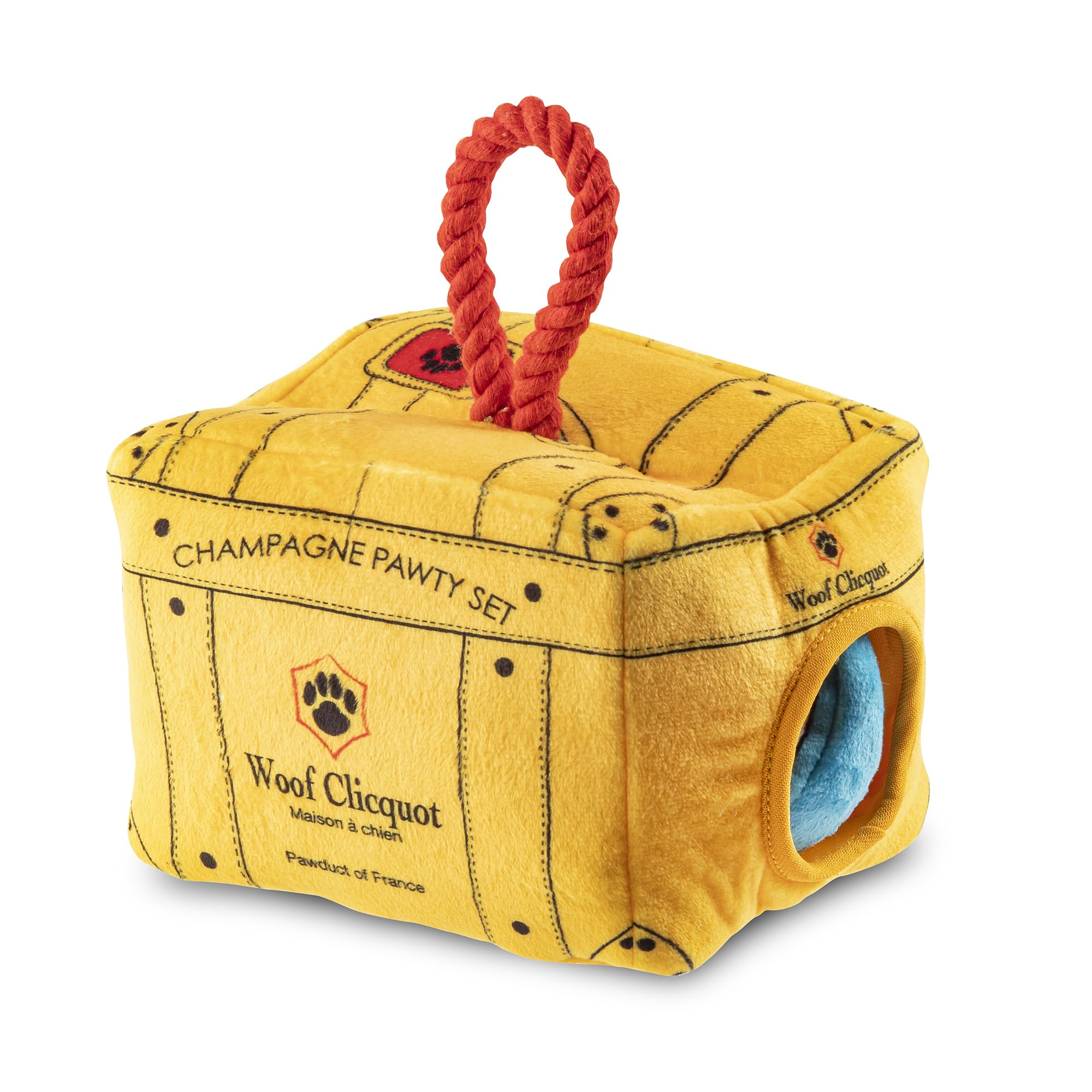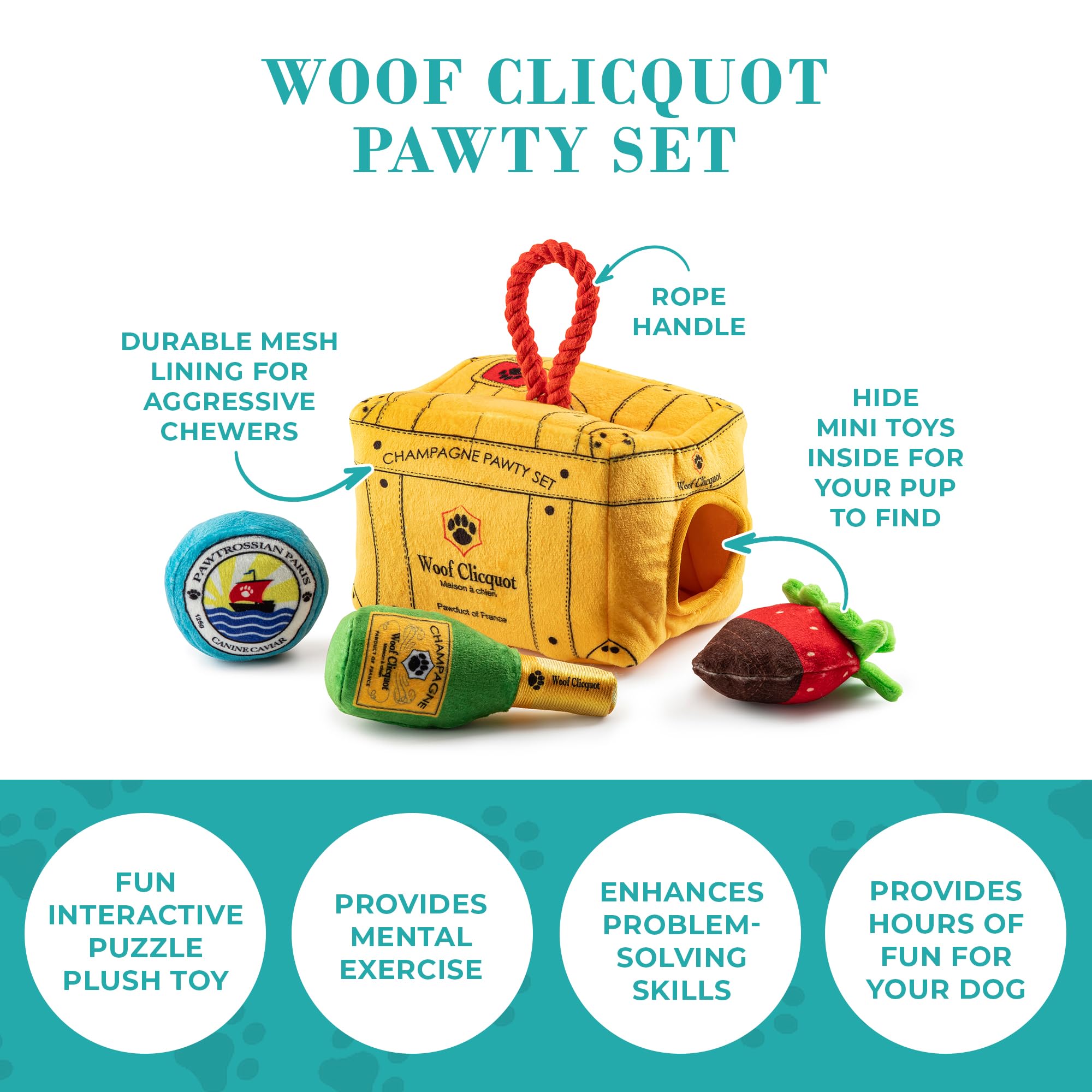 Funny Parody Plush Dog Toy: Keep your pampered pup entertained with our Woof Clicquot Pawty Set that features three cute picnic pawty plushies that can be hidden inside the chic trunk and great for interactive playtime with your pup. It’s a playful, cute dog puzzle toy that combines style & fun. Trunk 7”x5.5”x5”.
