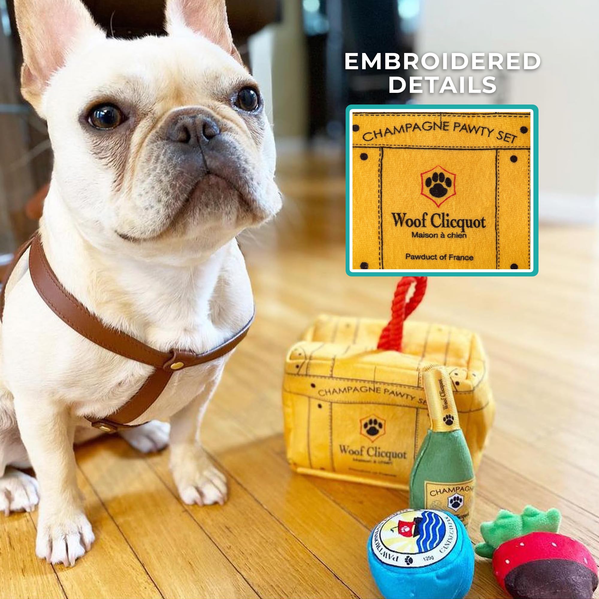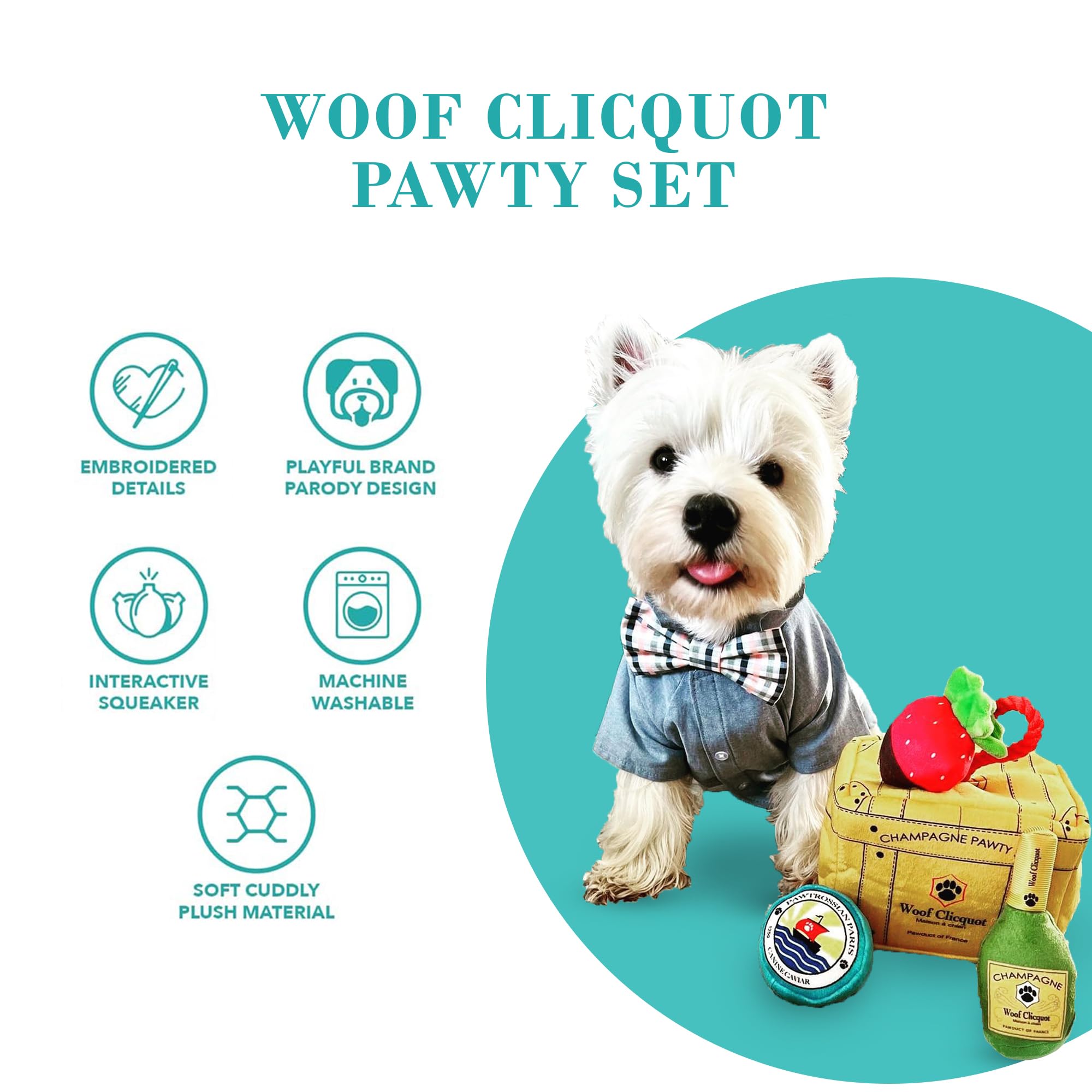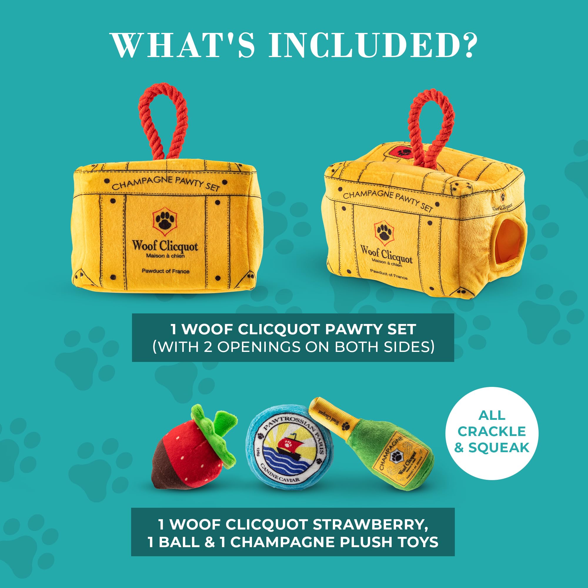 Funny Parody Plush Dog Toy: Keep your pampered pup entertained with our Woof Clicquot Pawty Set that features three cute picnic pawty plushies that can be hidden inside the chic trunk and great for interactive playtime with your pup. It’s a playful, cute dog puzzle toy that combines style & fun. Trunk 7”x5.5”x5”.