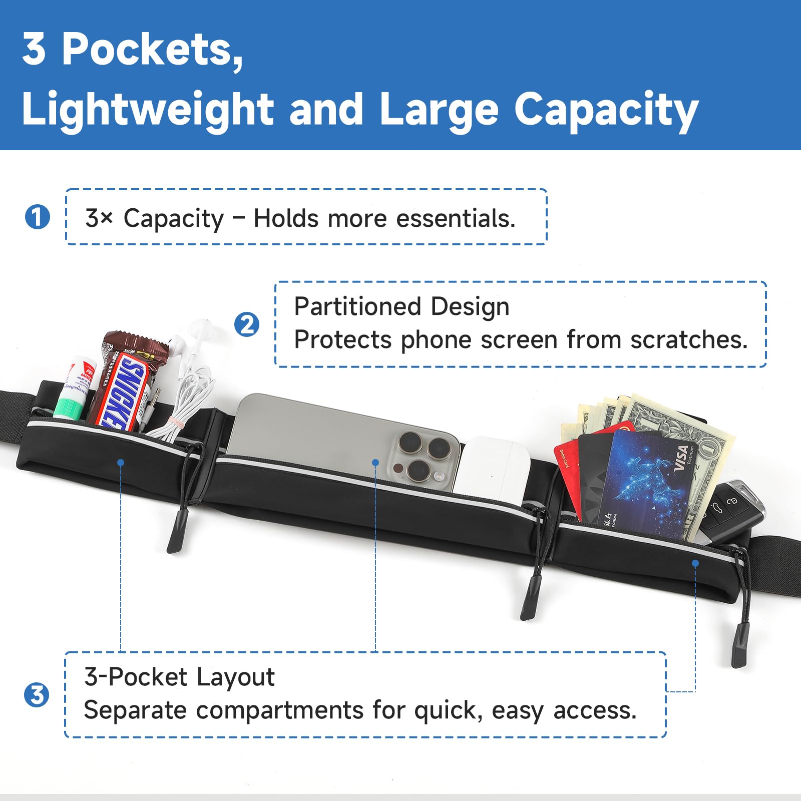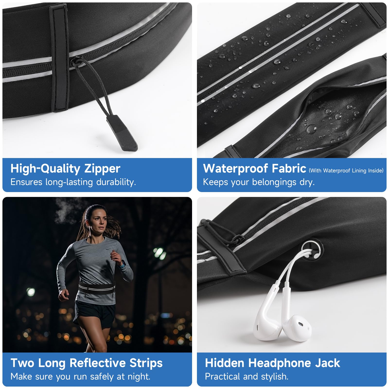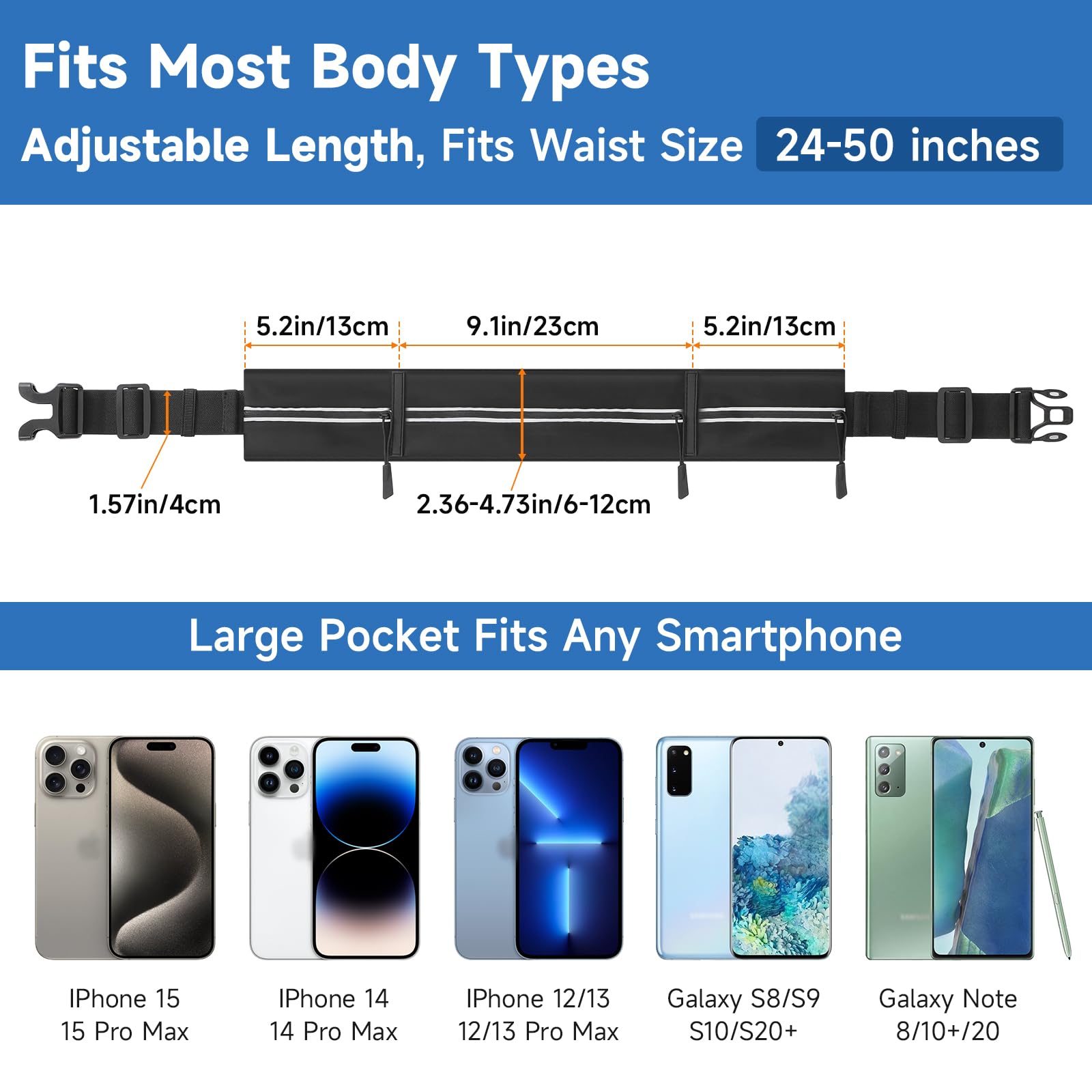 【Adjustable Waist Strap, No Moving During the Running】Running waist belt fits waist sizes from 24" to 50"inch, Durable elastic strap fits your waist perfectly, preventing the belt from moving while running