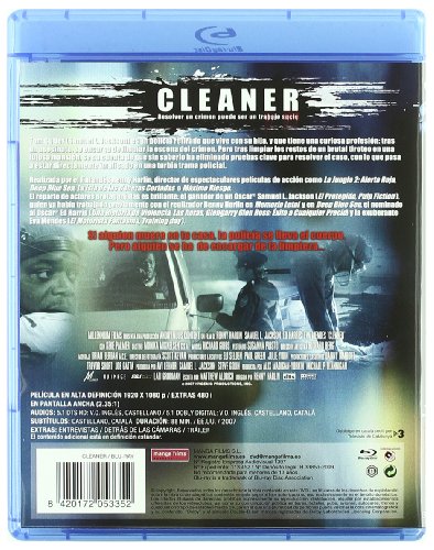 Spain released, Blu-Ray/Region B : it WILL NOT play on regular DVD player, or on standard US Blu-Ray player. You need multi-region Blu-Ray player to view it in USA/Canada: LANGUAGES: English ( Dolby Digital 5.1 ), English ( Dolby TrueHD ), English ( DTS 5.1 ), Spanish ( Dolby Digital 5.1 ), Spanish ( Dolby TrueHD ), Spanish ( DTS 5.1 ), Spanish ( Subtitles ), WIDESCREEN (2.35:1), SPECIAL FEATURES: Behind the scenes, Cast/Crew Interview(s), Interactive Menu, Scene Access, Trailer(s), SYNOPSIS: Tom Cutler, a retired police officer now runs a company which specialises in crime scene clean up. He is assigned a clean up job post a homicide. After doing the job he discovers that he has been conned into cleaning up a crime scene and must try to unravel the mystery behind what happened in that house. ...Cleaner