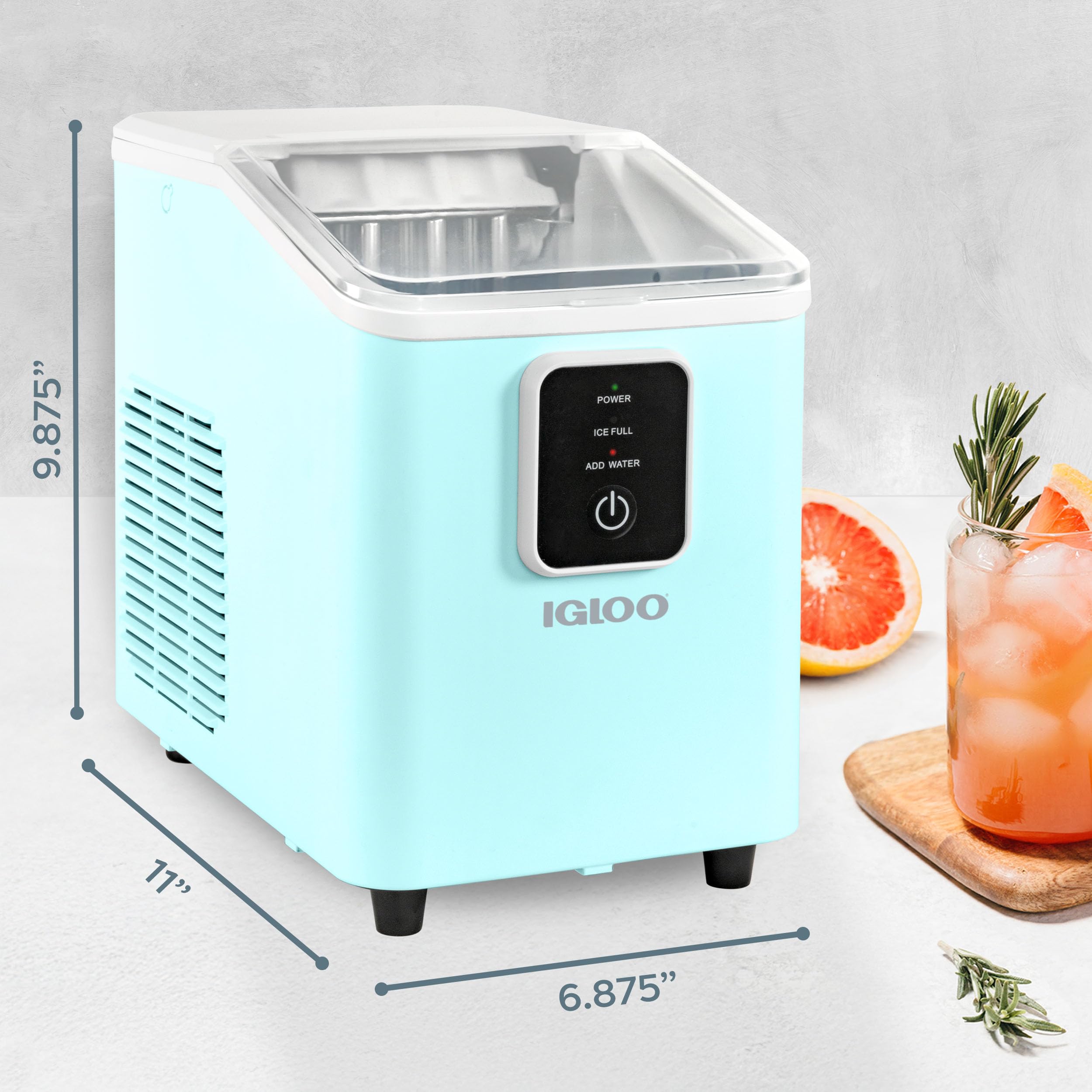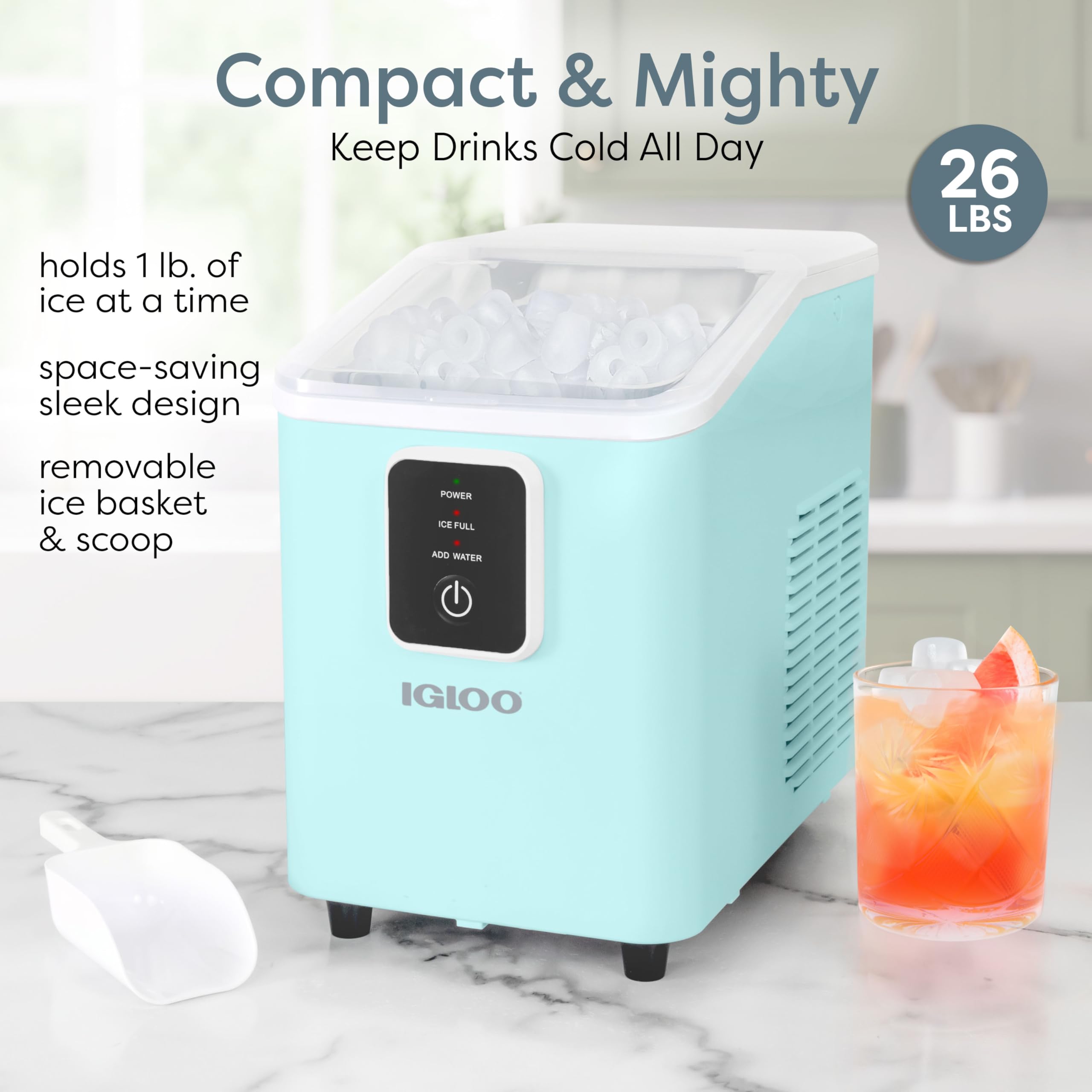 Meet the Igloo Self-Cleaning Countertop Ice Maker, your stylish and portable solution for keeping beverages perfectly chilled! In 7 minutes, you'll have your first batch of ice ready, and in a full day you can make up to 26 lbs. of ice. With a design that's sleek yet compact, you will save a ton of extra counterspace while still producing plenty of ice for keeping drinks cool. Operation is simple with a single-button control panel with LED indicator lights that signal when ice is full or water is needed. The included 1-pound ice basket and ice scoop ensures easy ice serving. The automatic five-cycle self-cleaning function makes clean up easy and allows clean ice to be made every time. Perfect for pool parties, home bars, dorm rooms, offices and more! Cold Drinks. Warm Smiles.
