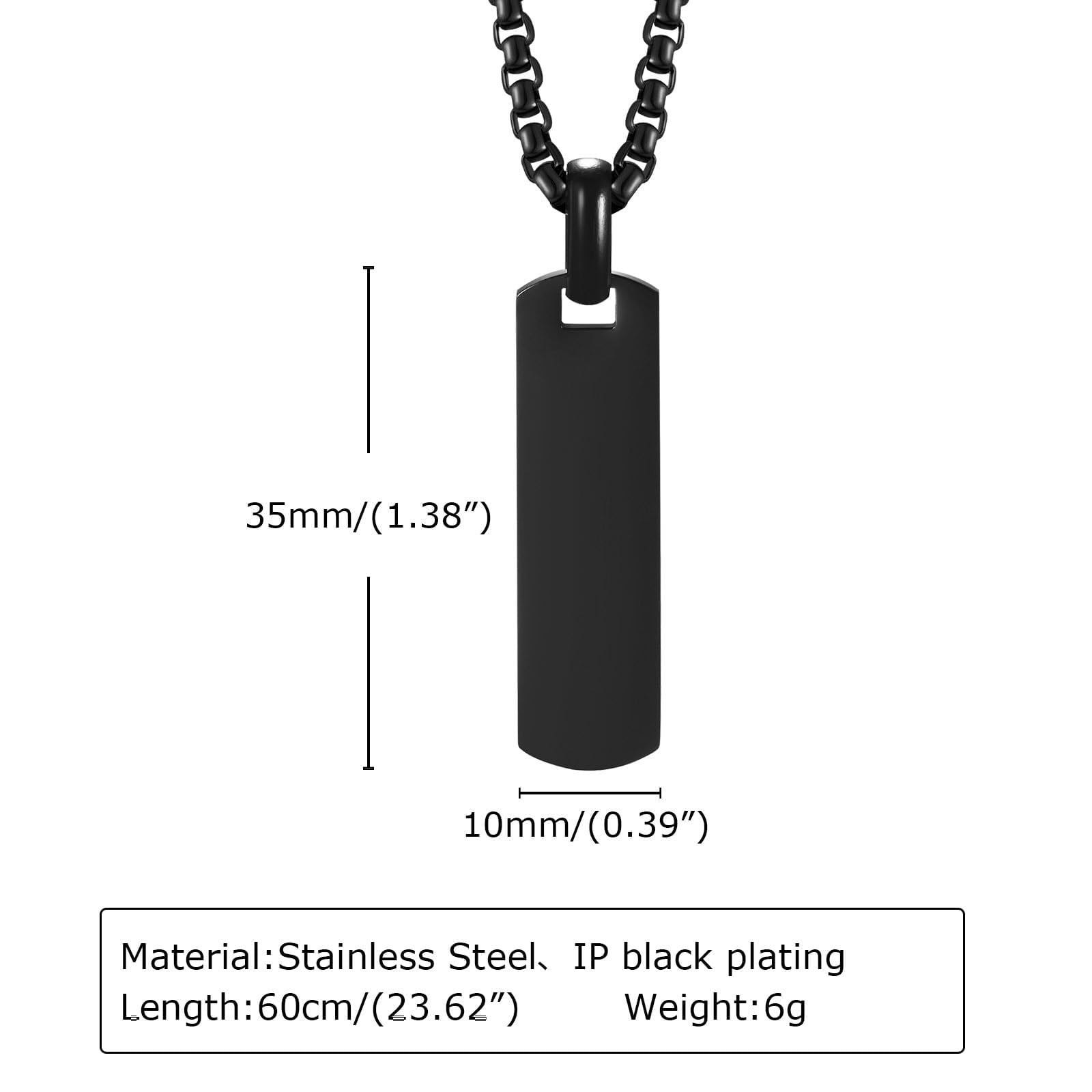 Material: created with quality 316l stainless steel,stainless steel high resistance to rust,corrosion and tarnishing.Size:Chain 24",26",28",30" optional- Pendant Width and length Size 0.39"*1.38".Style: trendy,easy to match and suitable for any Style of clothes.