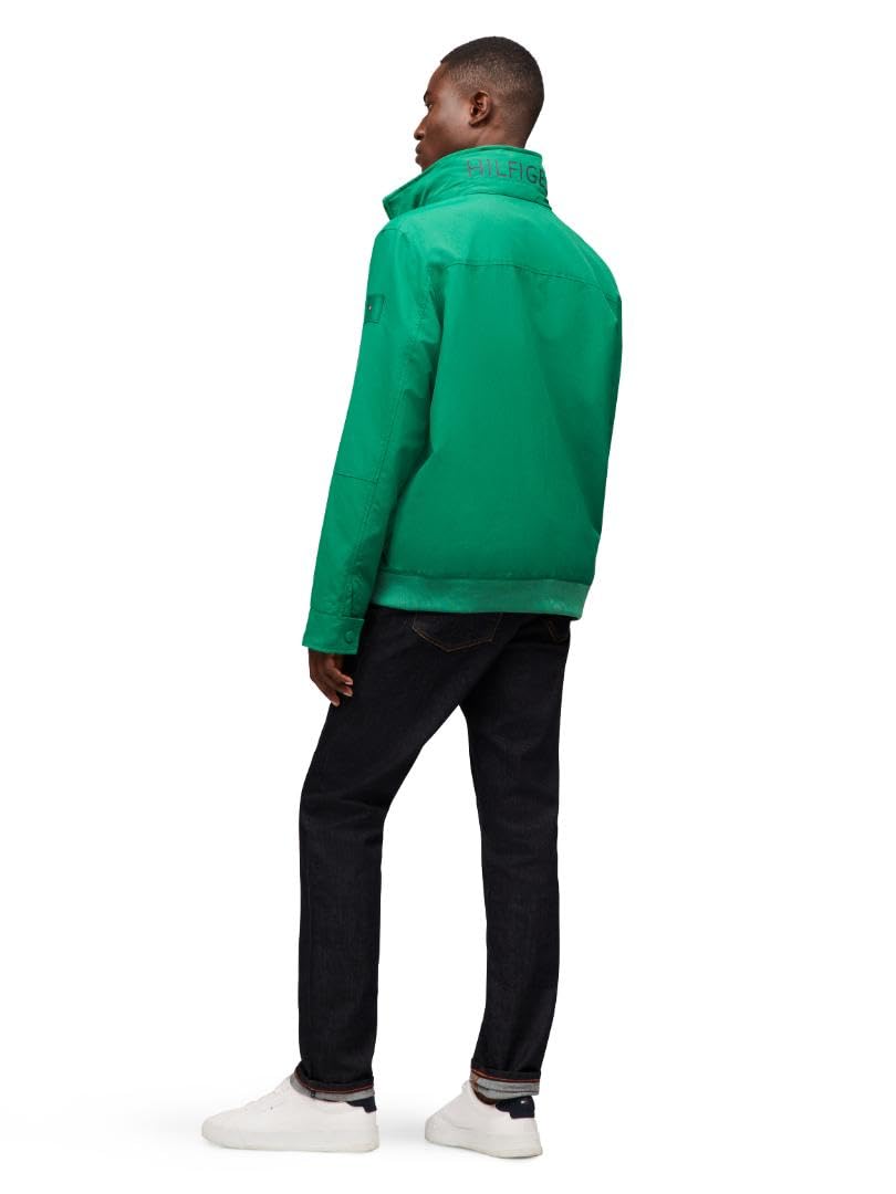 MADE FOR THE RAIN: Tommy Hilfiger’s waterproof mens bomber jacket features a lightweight, water-resistant nylon shell to keep you dry without the weight, while the protective packable hood can be tucked away into the collar on sunnier days.