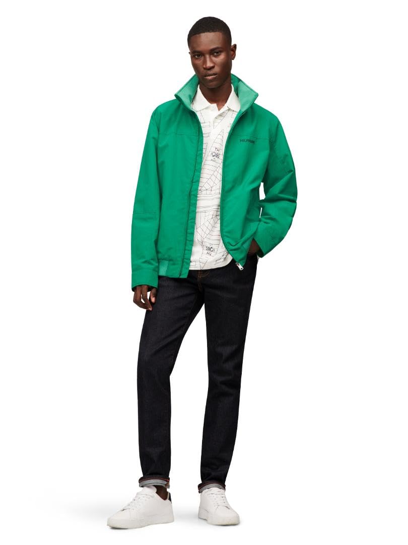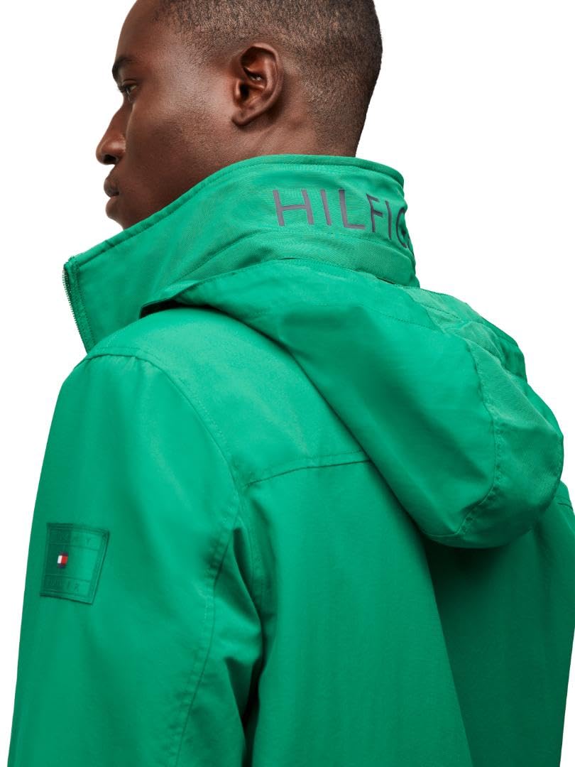 Description Layer up in this men's jacket from Tommy Hilfiger when the weather calls for added protection. Lightweight and waterproof. Zip front closure. Mock collar with packable hood. Slight waist open pockets; interior pocket with hook-and-loop closure.