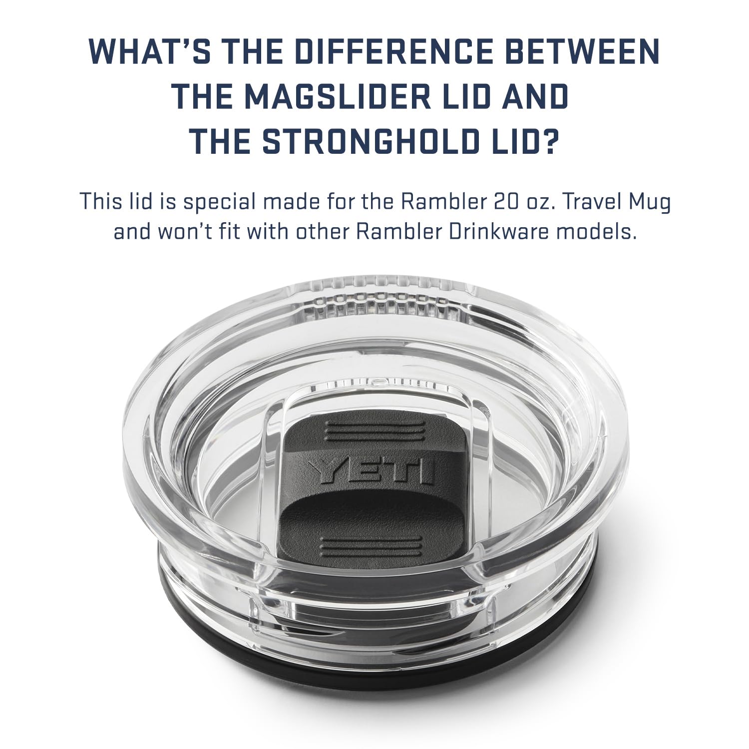 Please Note: The Travel Mug can only use the Stronghold Lid and the Stronghold Lid won’t fit other Rambler Drinkware models. The Travel Mug Stronghold Lid has 4 placement options and plays nice with both righties and lefties.