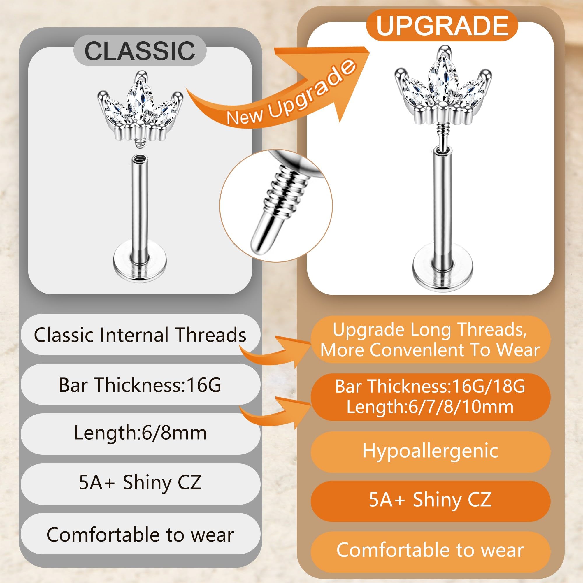 【Design&Size】Featuring an internal threaded design at the top and flat back design, the tragus cartilage earrings are easy to put on and take off. Bar length:6/7/8/10mm, bar gauge:1.2mm(16g)/1.0mm(18g), flat back diameter:4mm, gold and silver tone can be choice, suitable for most women to wear.