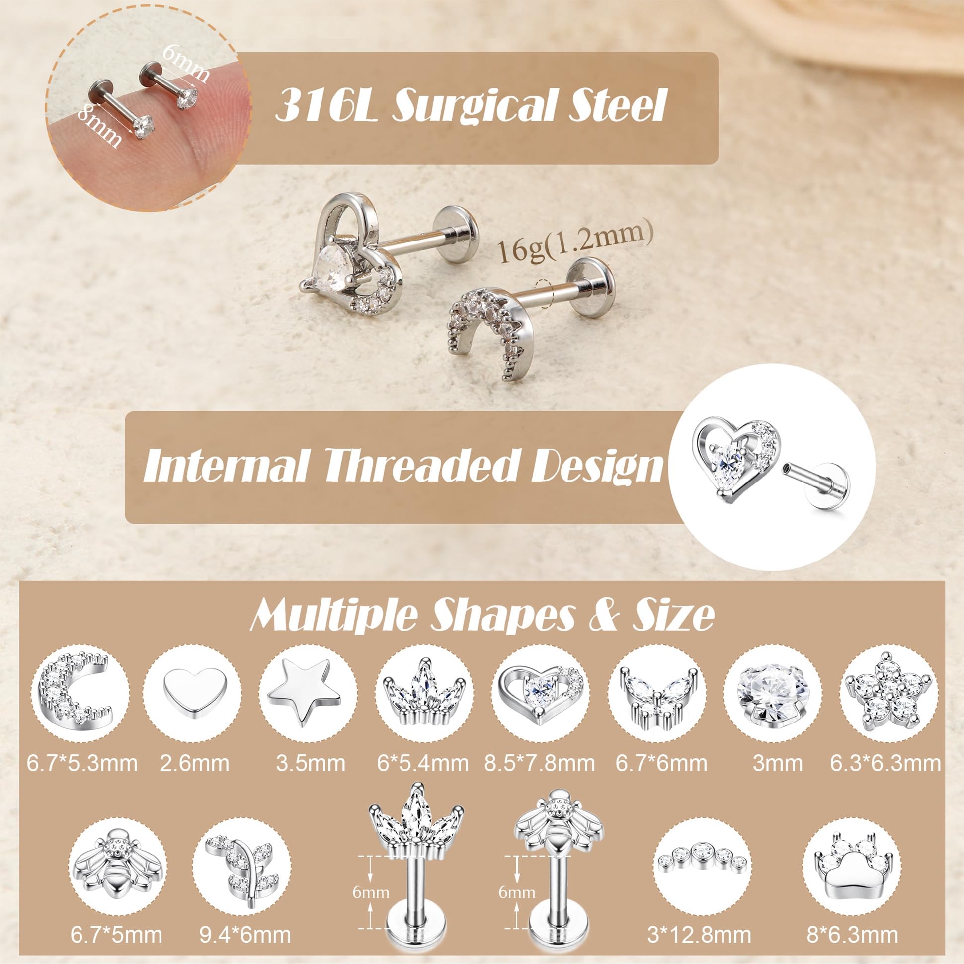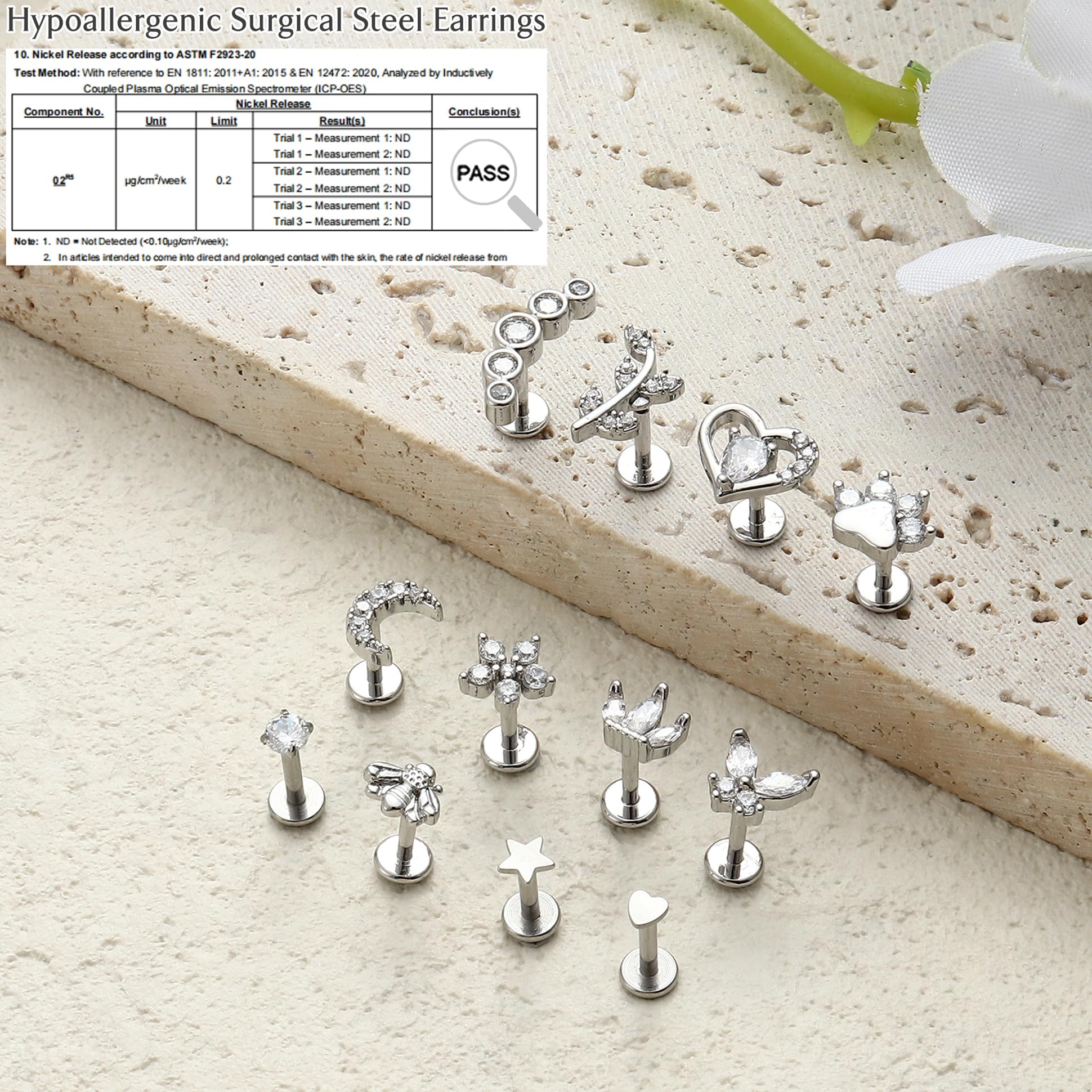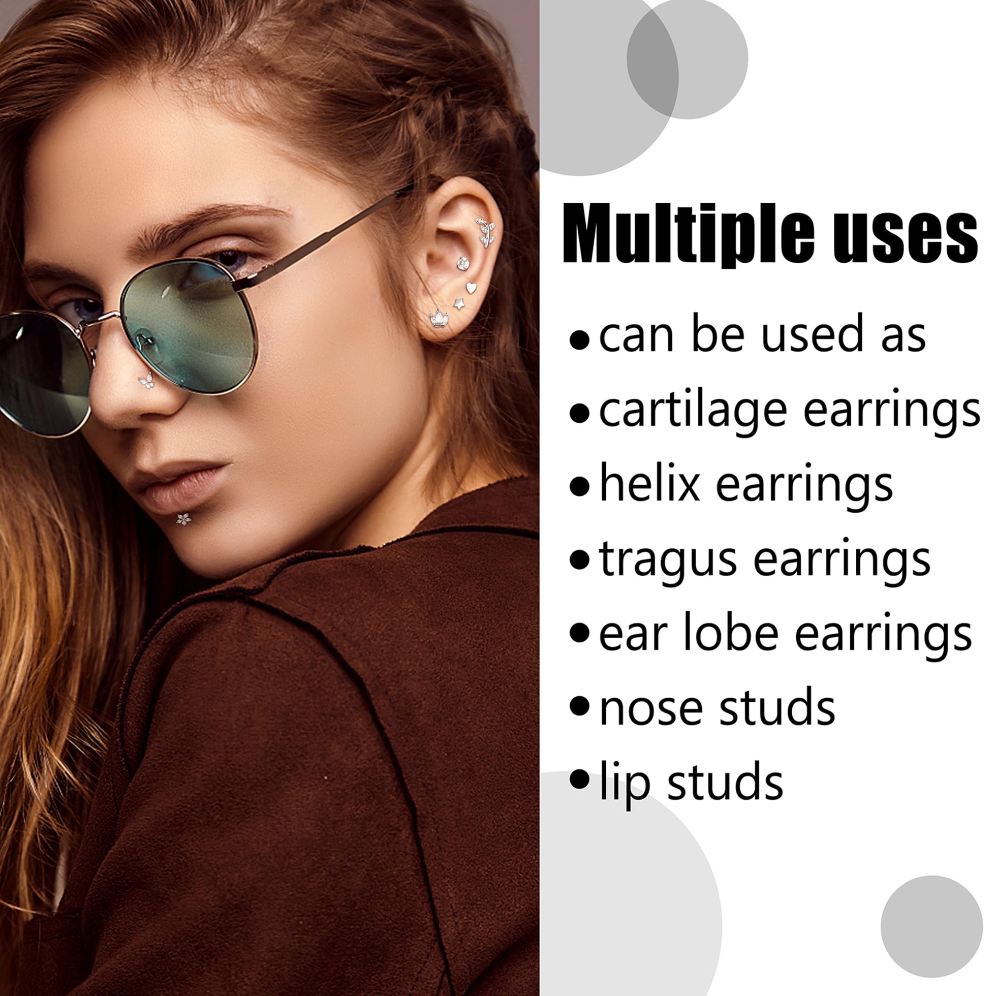 【Multi-functional Use】This flat back stud earring set can be used as tragus earring, cartilage piercing, helix piercing jewelry, conch earrings, labret jewelry, tragus piercing jewelry, cartilage earring and more, suitable for all occasions to wear, the perfect gift choice for the one you love.