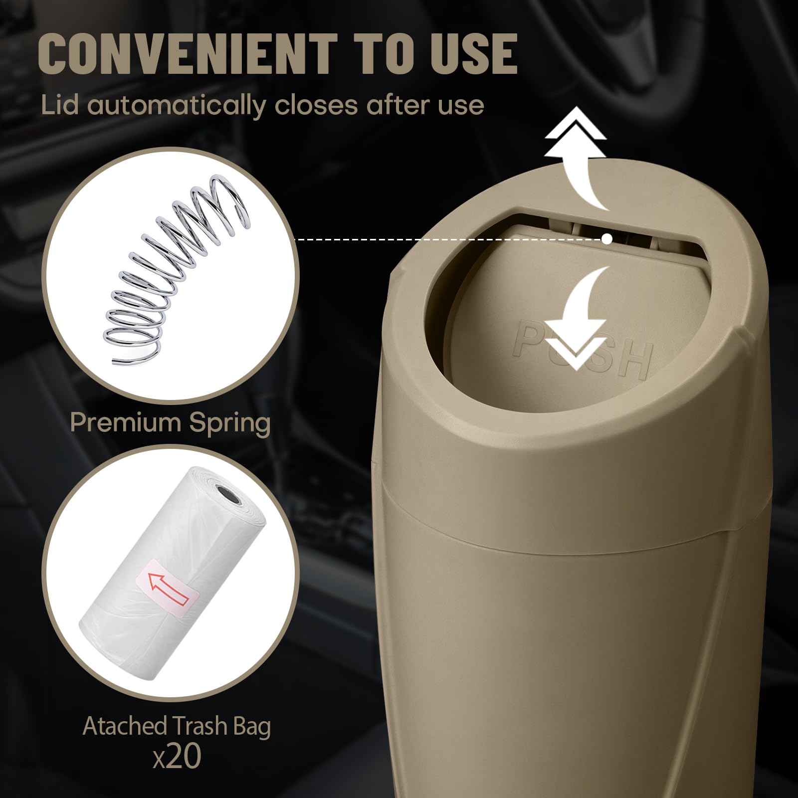 【Leakproof Design】 Our Vehicle Trash Can is equipped with a leakproof design and a spring-loaded lid that effectively prevents any spills. Its smooth interior is perfect for handling wet waste and makes cleaning a breeze.