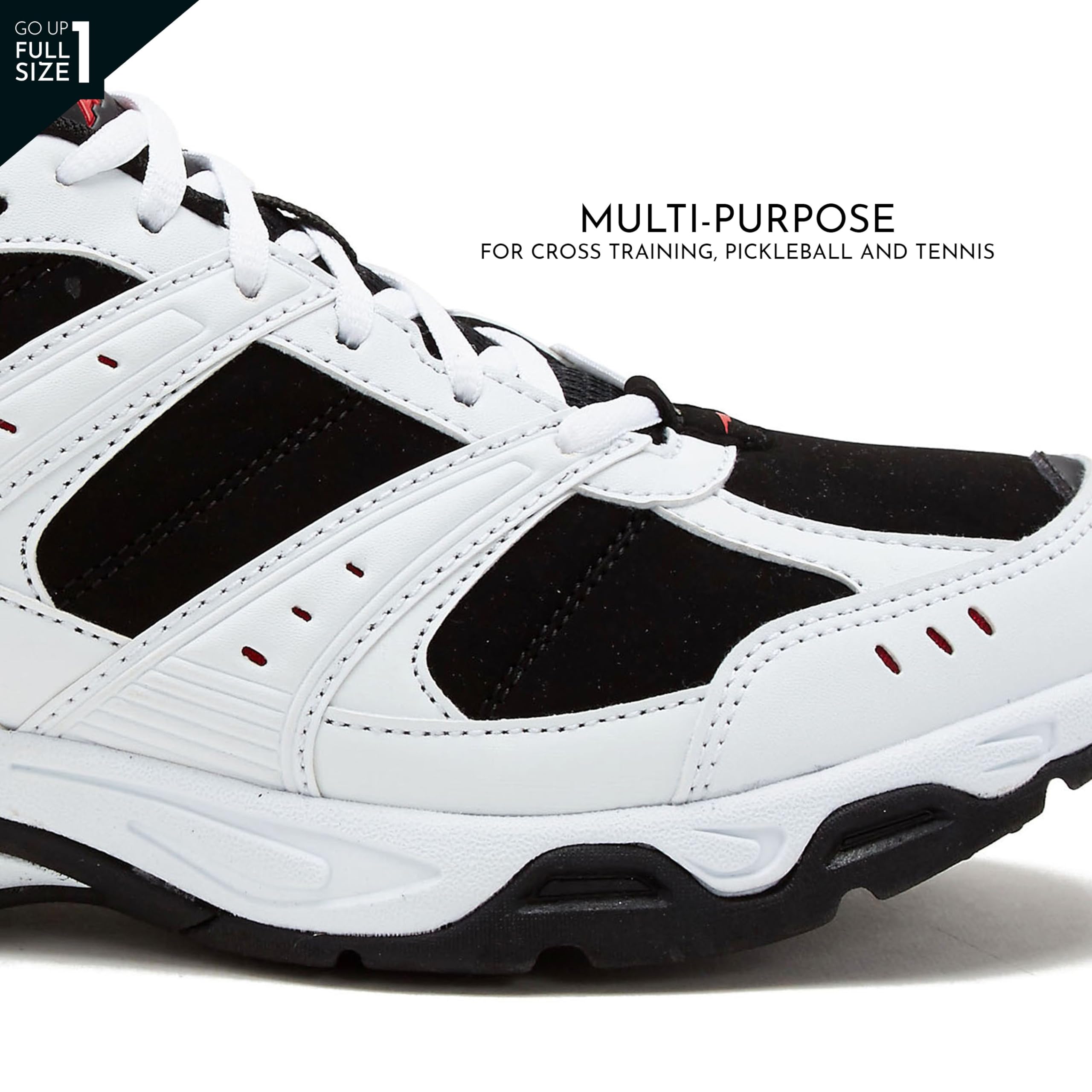 LIGHTWEIGHT PICKLEBALL SHOES MEN - Available in black, white and navy, and red and black, our mens sneakers size 11 to 16 and 7 to 10 are the most reliable sneakers for court sports or as cross trainer shoes.